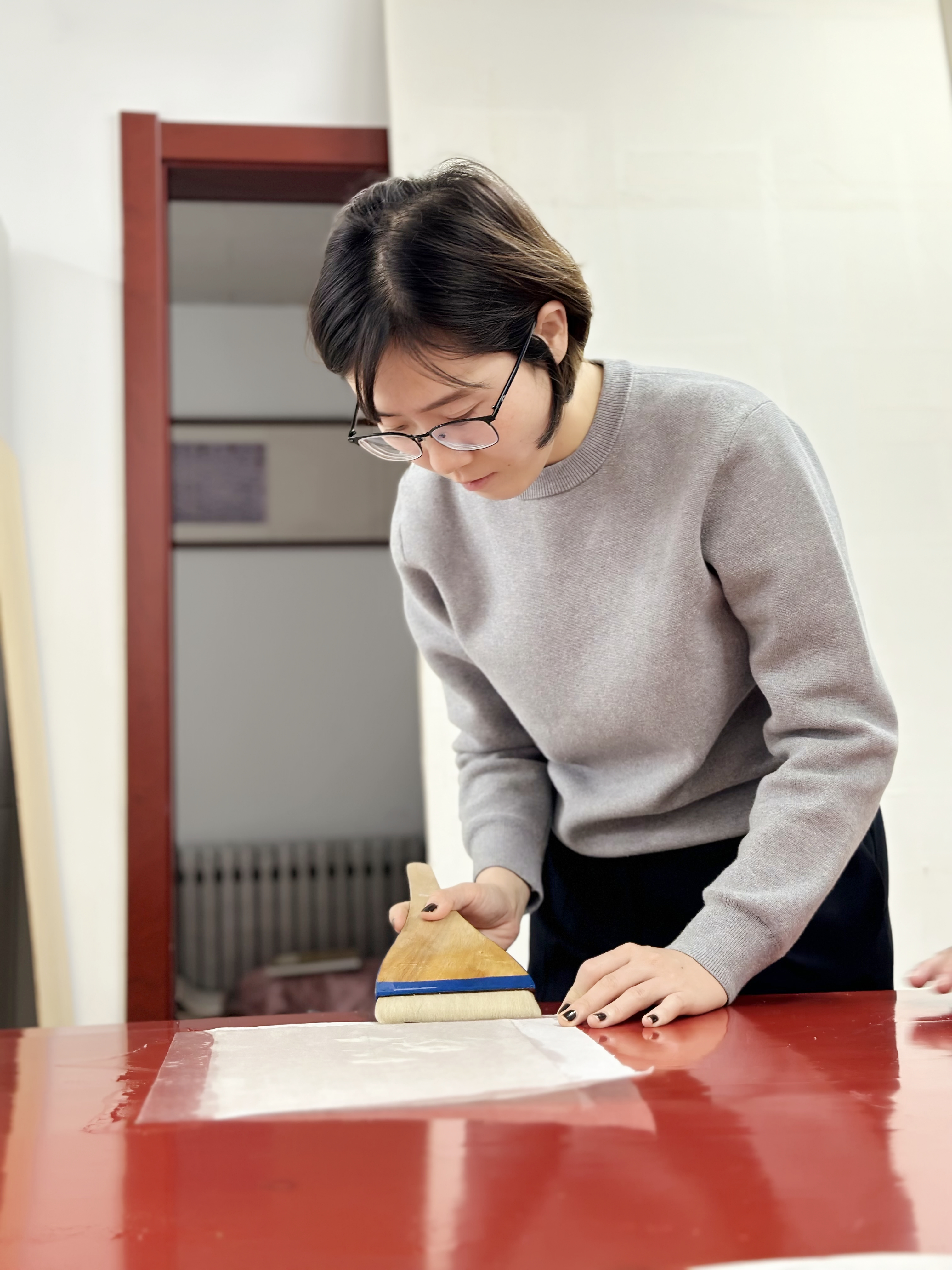教授揭裱后姜晓东再次重新为大家梳理了一下装裱的流程,拿出准备好的花笺让大家选出自己喜欢的花色、逐一指导装裱贴壁。