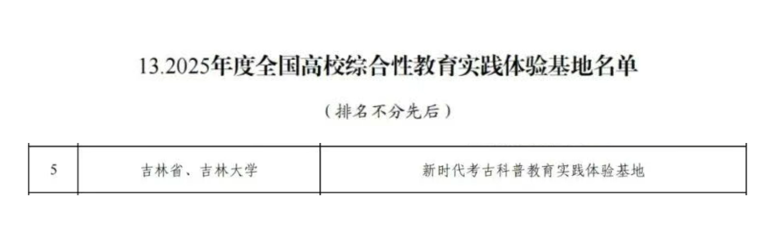 在“2025年度教育部高校思想政治工作质量提升项目”中,“新时代考古科普教育实践体验基地”获批“2025年度全国高校综合性教育实践体验基地”(全国共20个)。该基地依托吉林大学考古学科的深厚积淀,以田野考古实践教学为核心功能,构建起集科研创新、文物保护、实践训练与公众科普于一体的综合性平台。旨在为学生提供全面的田野考古实践训练和相关领域的知识与技能培养,有效提升公众文化遗产保护意识,践行考古育人社会责任。