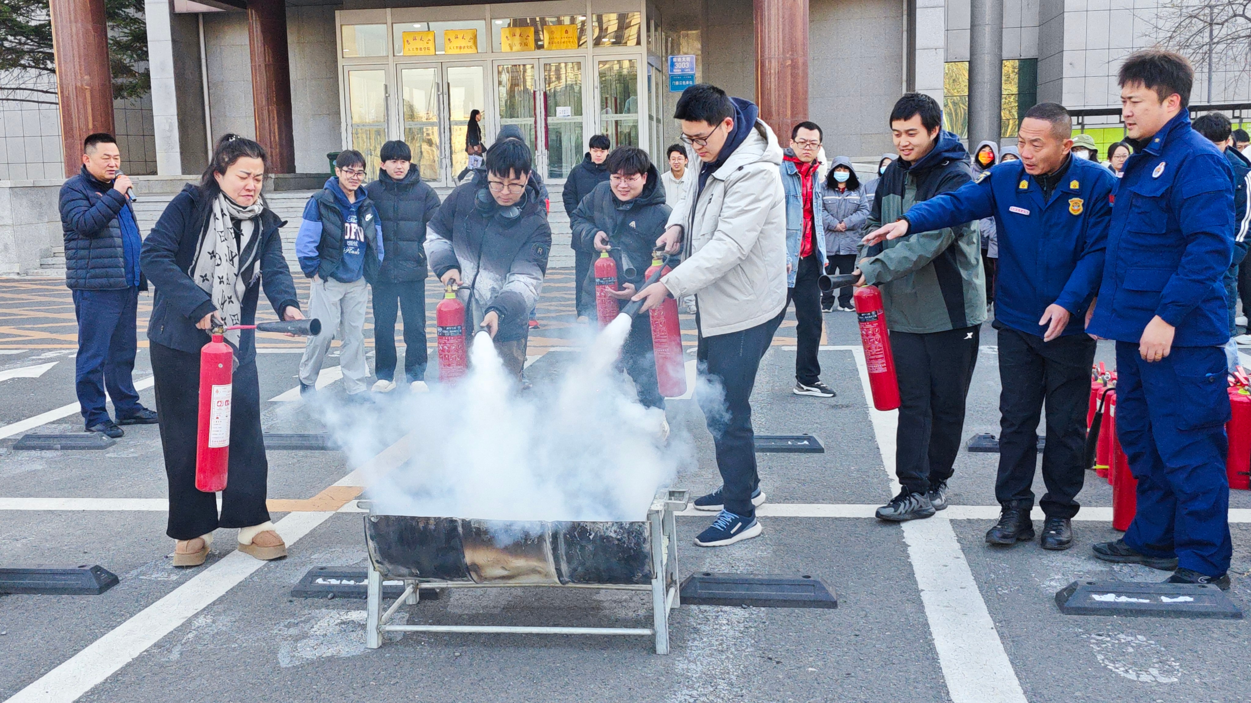 理论知识讲解过后,在场师生开展了灭火疏散演练。火灾警示声响起的同时烟雾弥漫,老师和同学们俯身捂住口鼻有序逃离了“火灾现场”。室外教学中,保卫处工作人员演示了消防面罩、灭火毯、干粉灭火器以及二氧化碳灭火器的使用方法,师生亲自上手演练,进一步提升了扑救初起火灾的能力,将消防知识内化于心外化于行。
