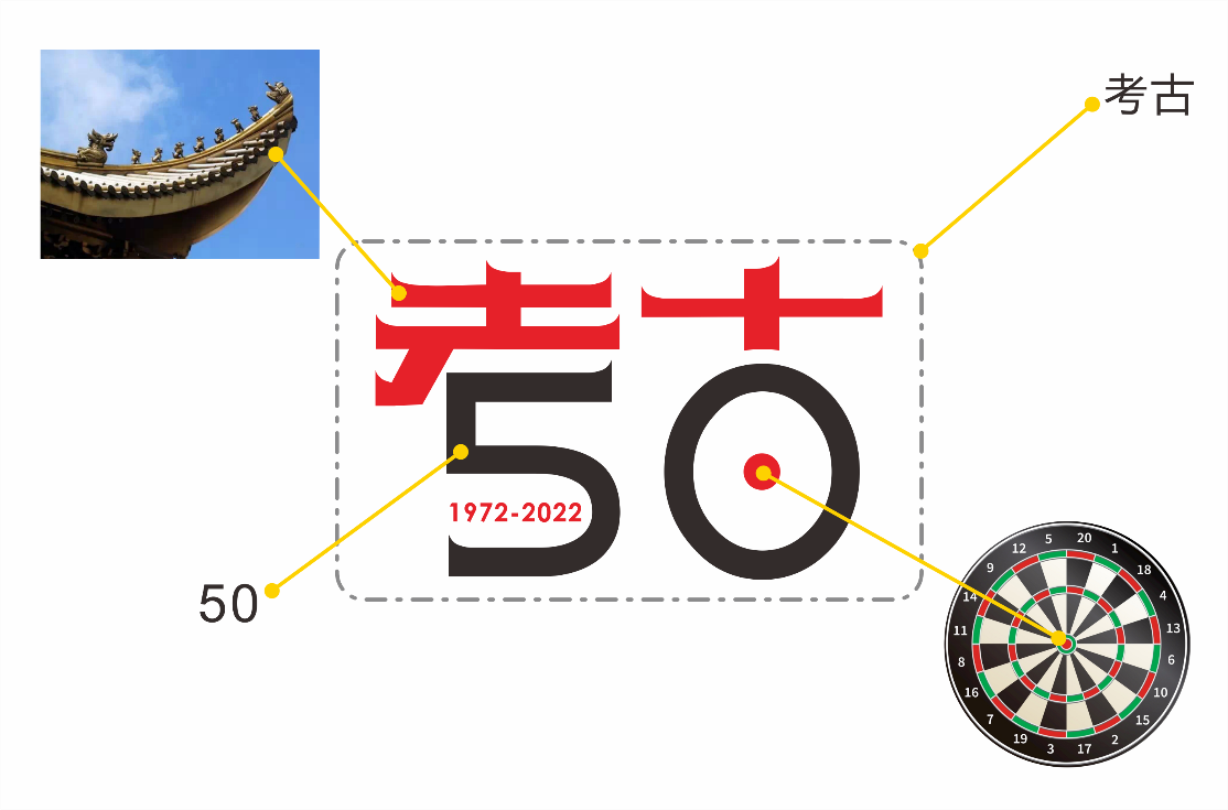 标识创意理念源自“考古”的汉字结构。上半部分提取古代建筑的飞檐元素,象征吉林大学考古学科的发展蒸蒸日上。下半部分采用“共用形”的设计方法,将数字“50”与靶子图形巧妙融入,靶心位置象征中国特色、中国风格、中国气派的考古学建设目标。