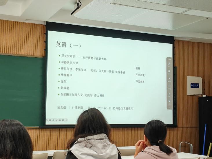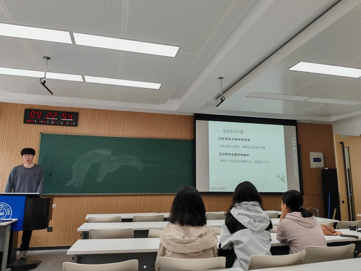 随后,袁鸣从准备、学习、冲刺三个备考阶段展开介绍,并对确定目标、合理安排起居、制定学习计划等方面进行了重点讲解,条理细致、逻辑清晰地和同学们分享了考研政治、考研英语的方法,并建议大家在复习专业课时合理安排,及时整理、多多关注学术热点问题。