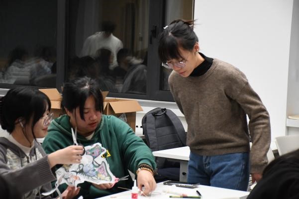 在何涛同学的宣讲之后,活动进入大家期待已久的风筝制作环节。风筝的制作过程包括扎骨架、剪风筝纸、糊风筝、穿绳固定等等,看似简单,但做起来并不容易。大家在文保协会成员张雯洁、林彦蓉的带领下,两两合作,从扎骨架开始,一步一步将手中零散的材料粘合连接。文保协会的其他成员也穿梭在过道间,为需要指导的同学提供一对一的帮助。