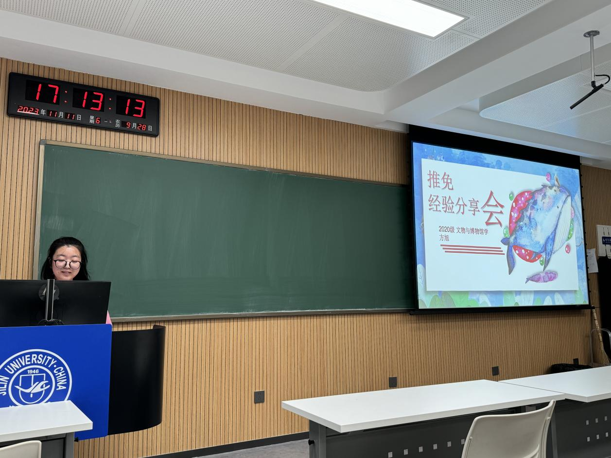 最后进行分享的是文物与博物馆专业的方旭、李逸然同学。方旭同学通过幽默诙谐的发言,结合自身专业特点,详尽分享了重视平时学习、努力争取实习机会、积极准备复试等宝贵经验;李逸然同学也结合自身在博物馆的实习经历,分享了保研过程与注意事项。二位同学的分享为有志于在文博专业进行深造的同学提供了宝贵参考。