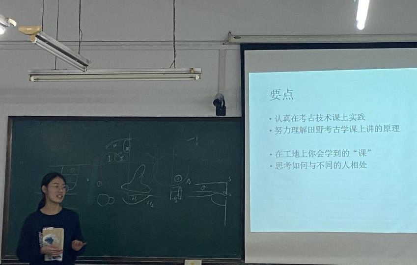 鲁婕同学的分享分为实习概况、实习内容和实习片影三部分。在实习内容部分,她重点讲述了田野发掘的工作方法,并以自己探方中两处较特殊的遗迹现象为例,向同学们生动形象地说明发掘过程中应当怎样运用平剖结合的发掘方法解决问题。