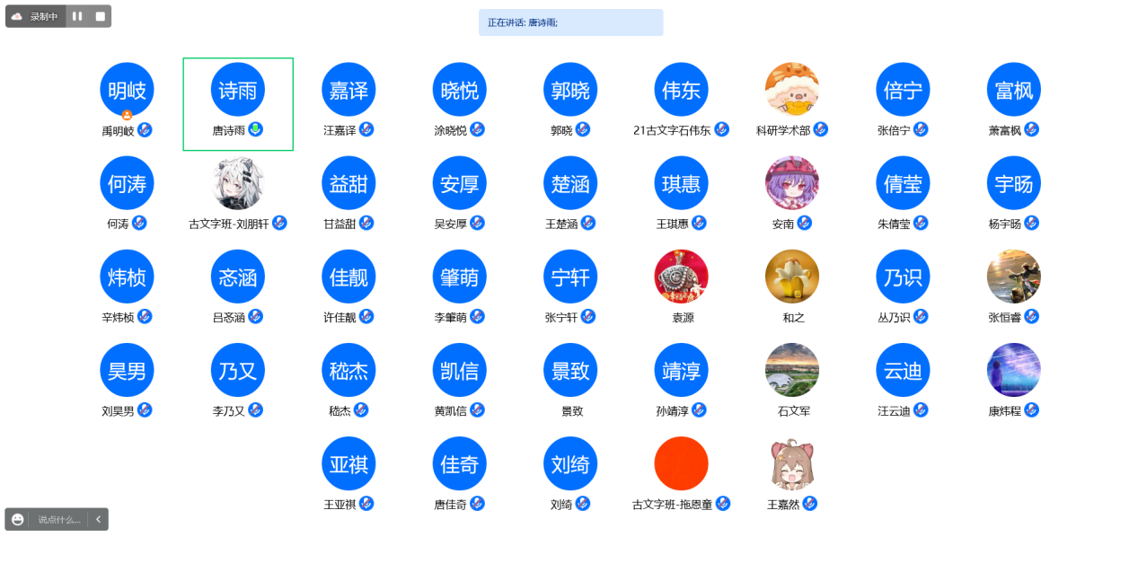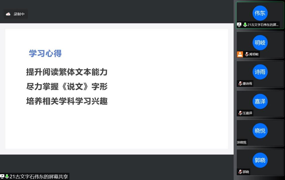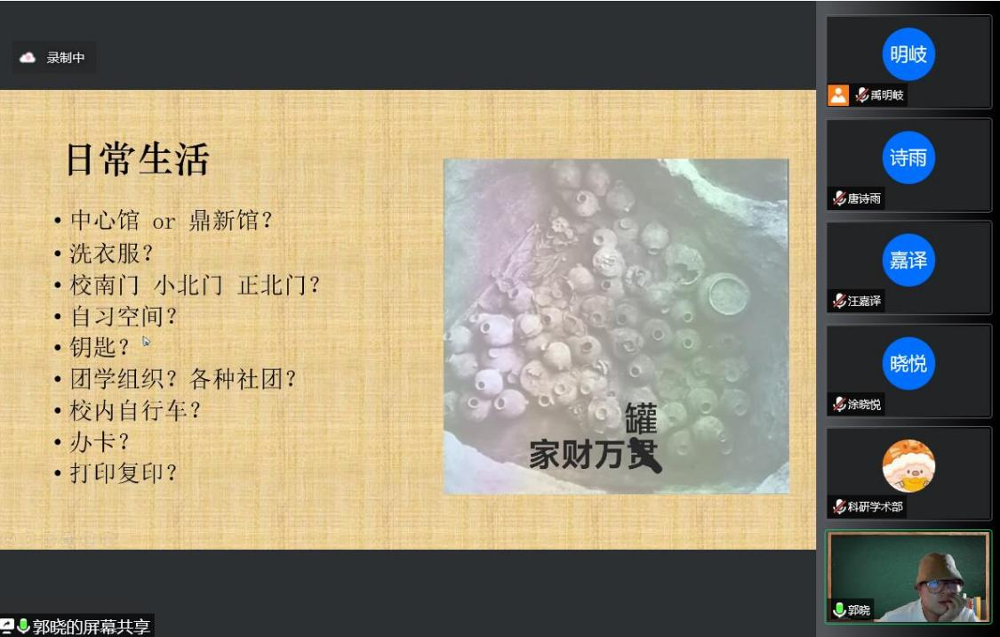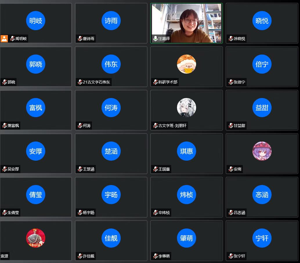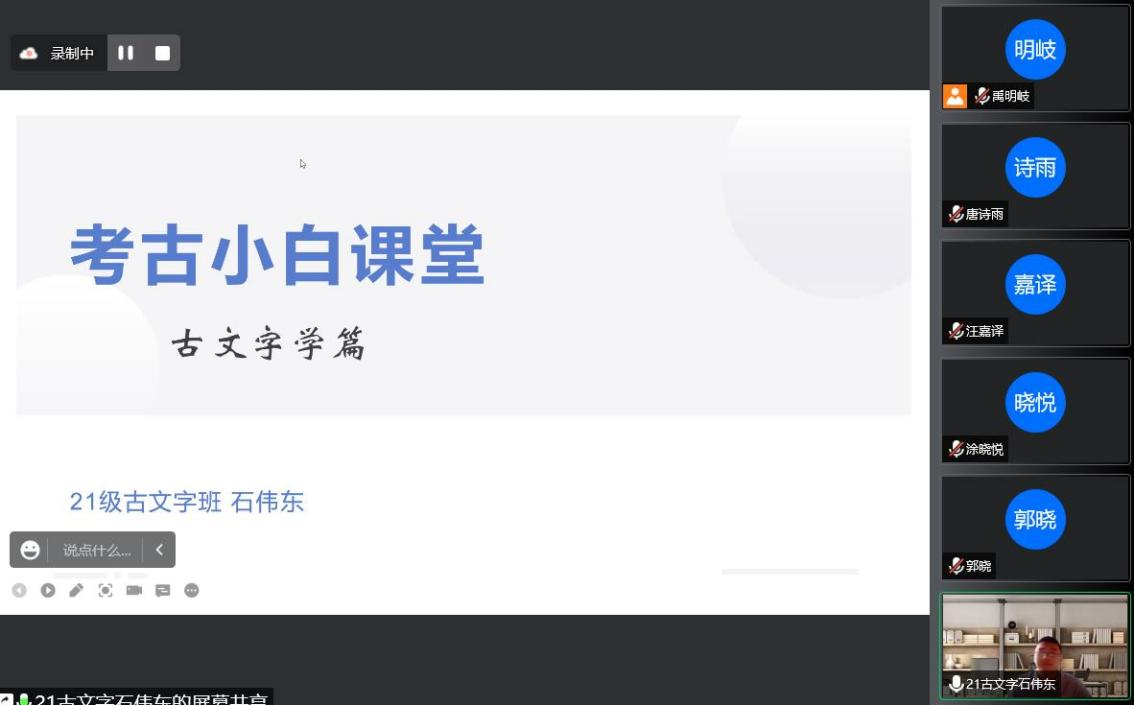 学生会汪嘉译同学主持,21级考古班唐诗雨同学,21级文博班郭晓同学和21级古文字班石伟东同学进行了分享。