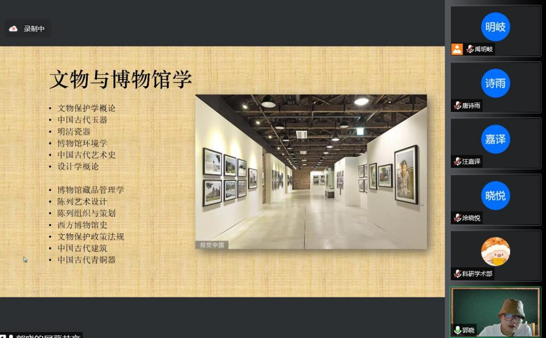 接下来,郭晓同学从文博专业角度出发,向新生详细介绍了文物与博物馆学的概念和相关课程。随后郭晓同学推荐了《博物馆里的极简中国史》、《博物馆藏品管理学》等经典书目以及《我在故宫修文物》、《国家宝藏》等优秀纪录片。并在新生日常生活如自习空间,社团,团学组织等方面提供了许多宝贵的建议。相信郭晓同学风趣幽默的讲解会给刚刚步入大学的新生们带来很大的帮助。