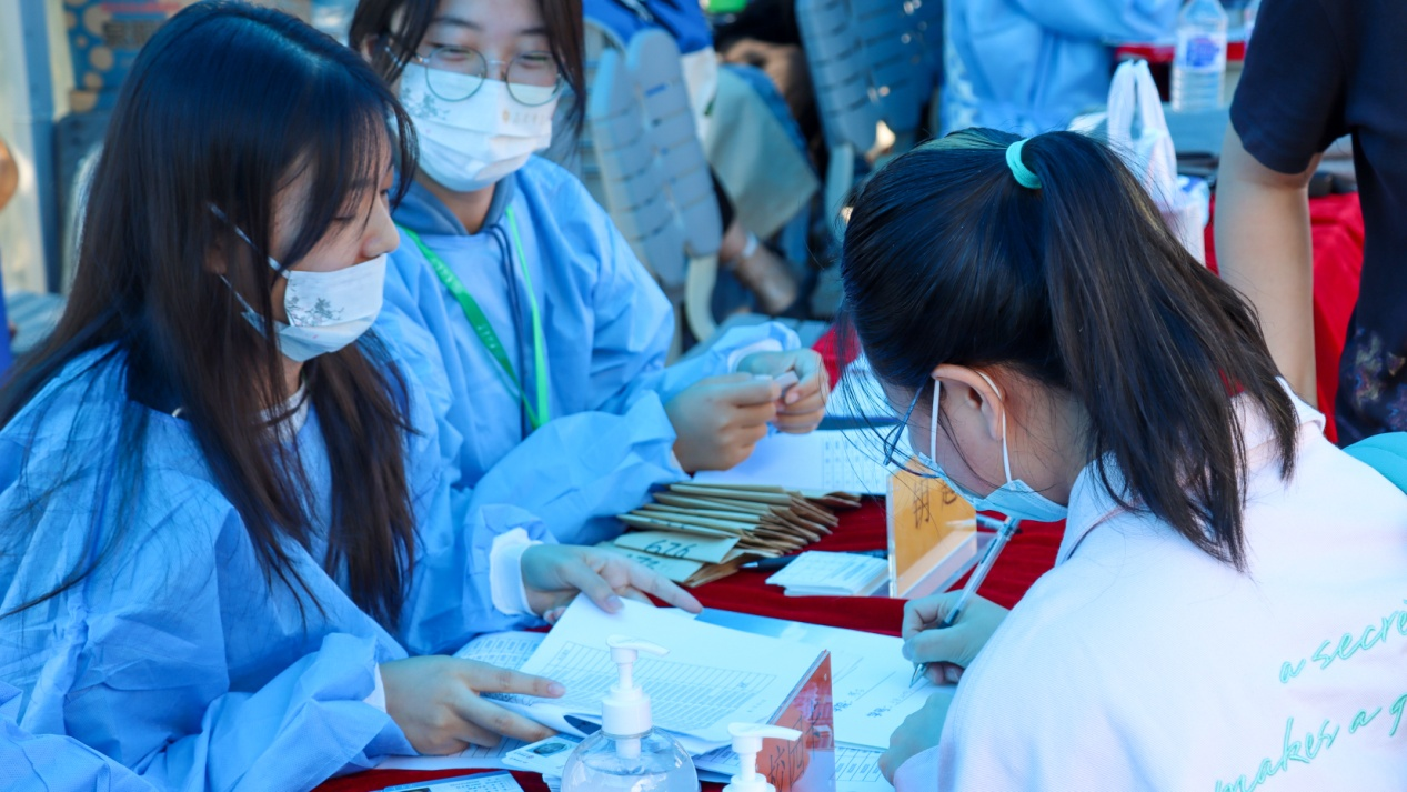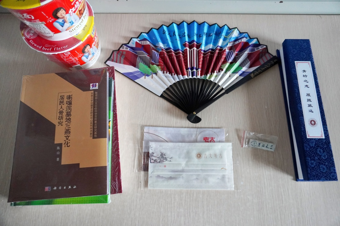 在迎新正式开始之前,学院为22级考古新生们准备好了“迎新礼包”。为配合疫情防控,也为大家减轻行李负担,专业类礼品书籍提前放在了学生寝室的桌子上,等待各位小主人亲自揭晓。定制的精美折扇,吉大考古文创口罩,则是在迎新现场亲手交给新同学们。