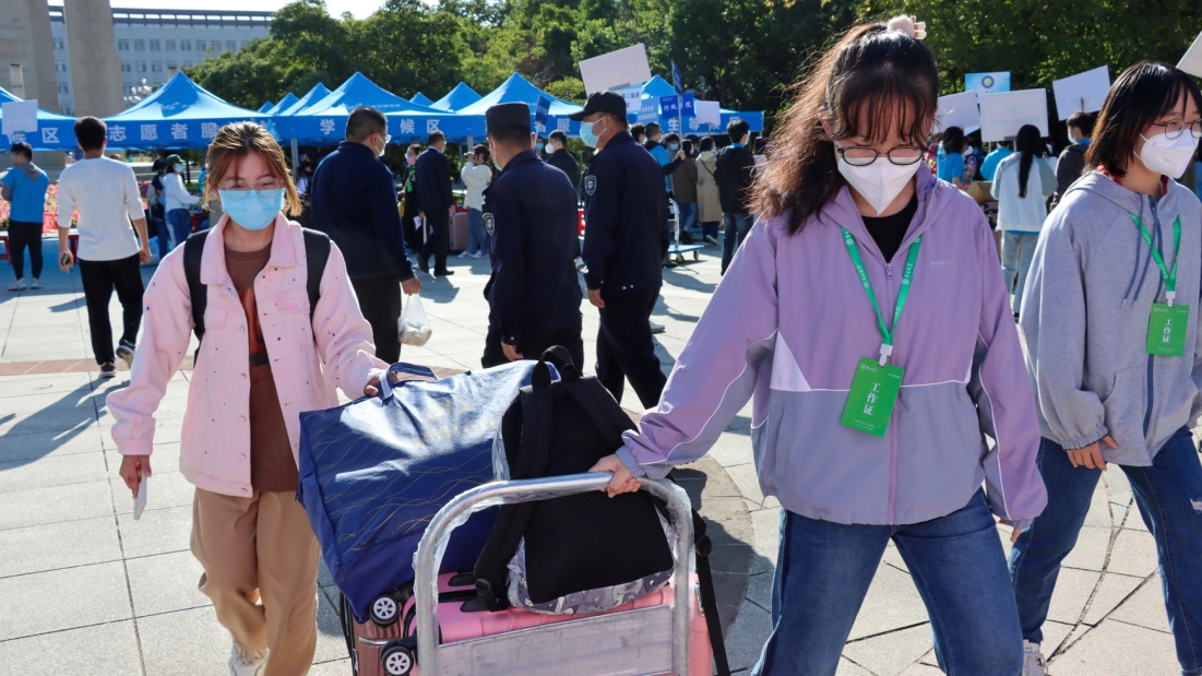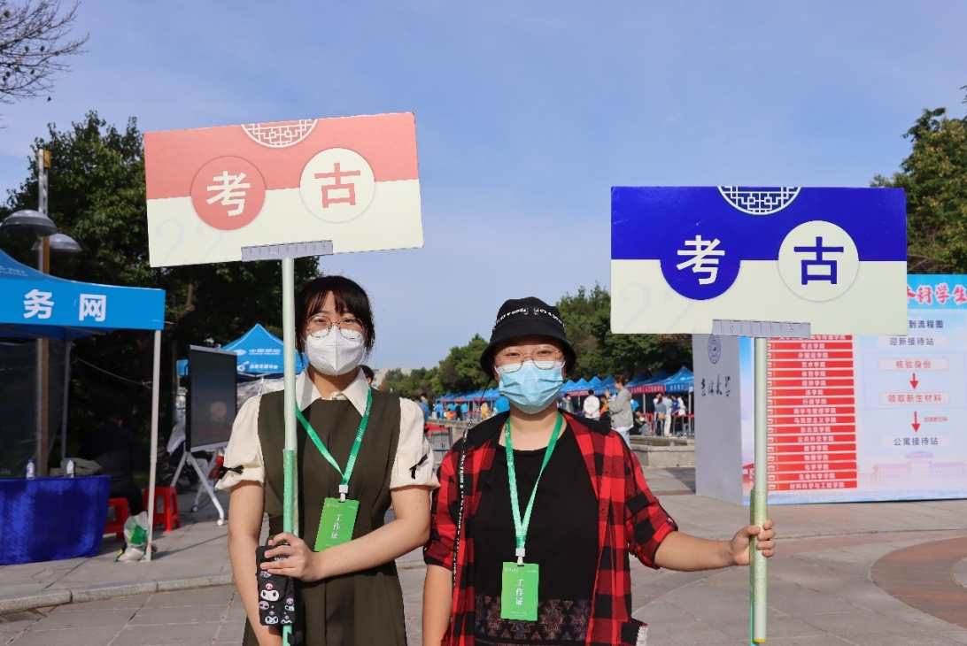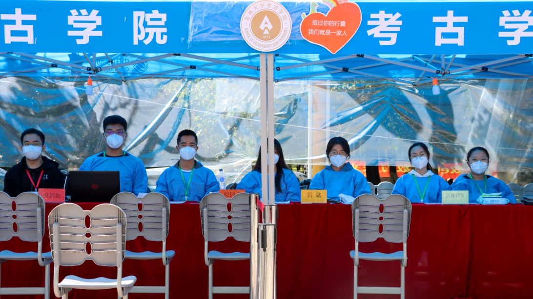 本次迎新分为三个阵地,迎新志愿者们分头行动又配合密切。第一阵地为广场引导,迎新志愿者们翘首以盼,手持醒目的“考古”字样的标牌,为初入校园的考古新生们提供直接引领,引领他们到接待站进行报到。第二站是迎新接待站,四位辅导员助理协同辅导员邱泽涵老师,为新生的报到保驾护航。核验信息、检查档案,发放寝室钥匙、校园一卡通和防疫物资,一套流程一气呵成,工作有条不紊。老师同学们细致认真,耐心引导,给新生们留下良好的印象,感受到如家一般温暖的迎接。第三阵地是行李搬运。志愿者们积极热心,引领师弟师妹们抵达寝室并帮助他们运送行李。一路上也会和师弟师妹们介绍一下他们眼中尚是陌生的校园。