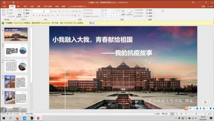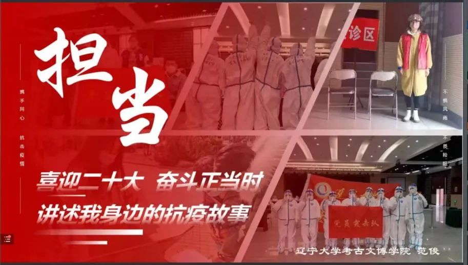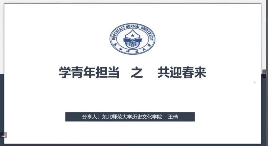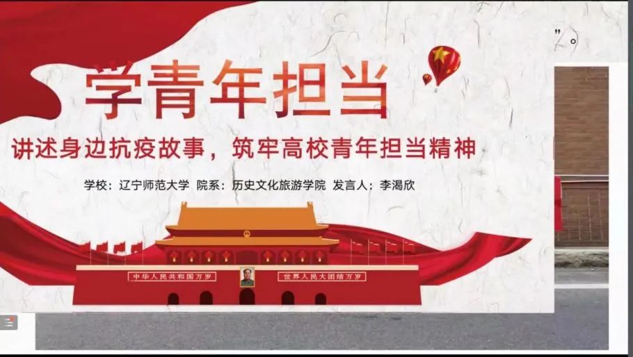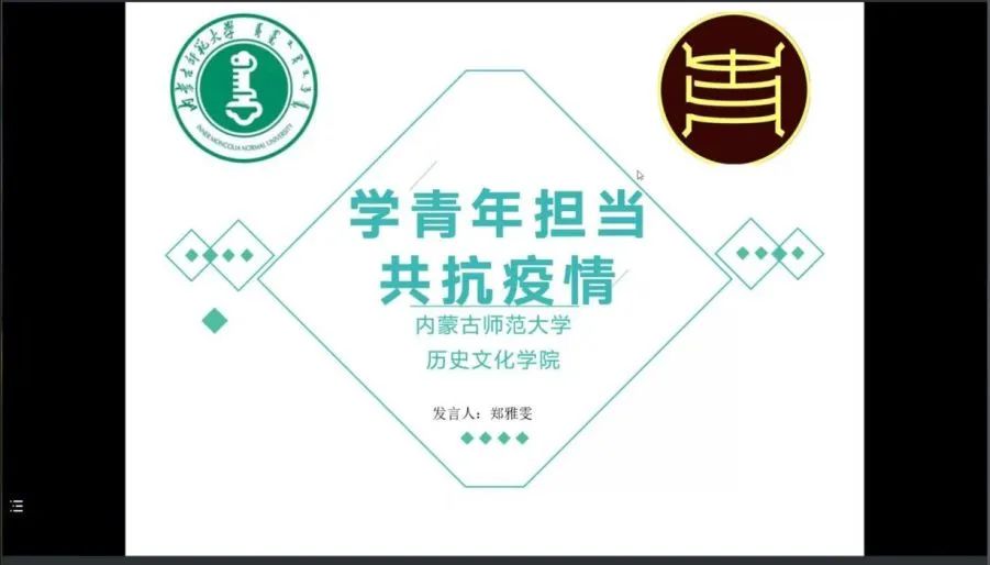 自2020年新冠肺炎疫情暴发以来,全国各地陆续出现了多起疫情风波。高校青年学子在参加防疫抗疫的过程中谱写了一个个先进典型事迹,展现了新时代青年学子的担当精神。活动的第二环节,由各高校学生代表讲述身边的抗疫故事。来自赤峰学院历史文化学院的李昊泽、东北师范大学历史文化学院的王琦、黑龙江大学历史文化旅游学院的张哲愚、辽宁大学考古文博学院的范俊、辽宁师范大学历史文化旅游学院的李渴欣、内蒙古大学历史与旅游文化学院的邵宸、内蒙古师范大学历史文化学院的郑雅雯共七位学生代表,分别从学院党团支部如何发挥战斗堡垒作用,青年党员如何在疫情防控中如何发挥模范带头作用等多个角度,分享了自己学校在属地疫情防控期间的抗疫故事和经验,诠释了青年学子以实际行动践行青春使命的光辉事迹。