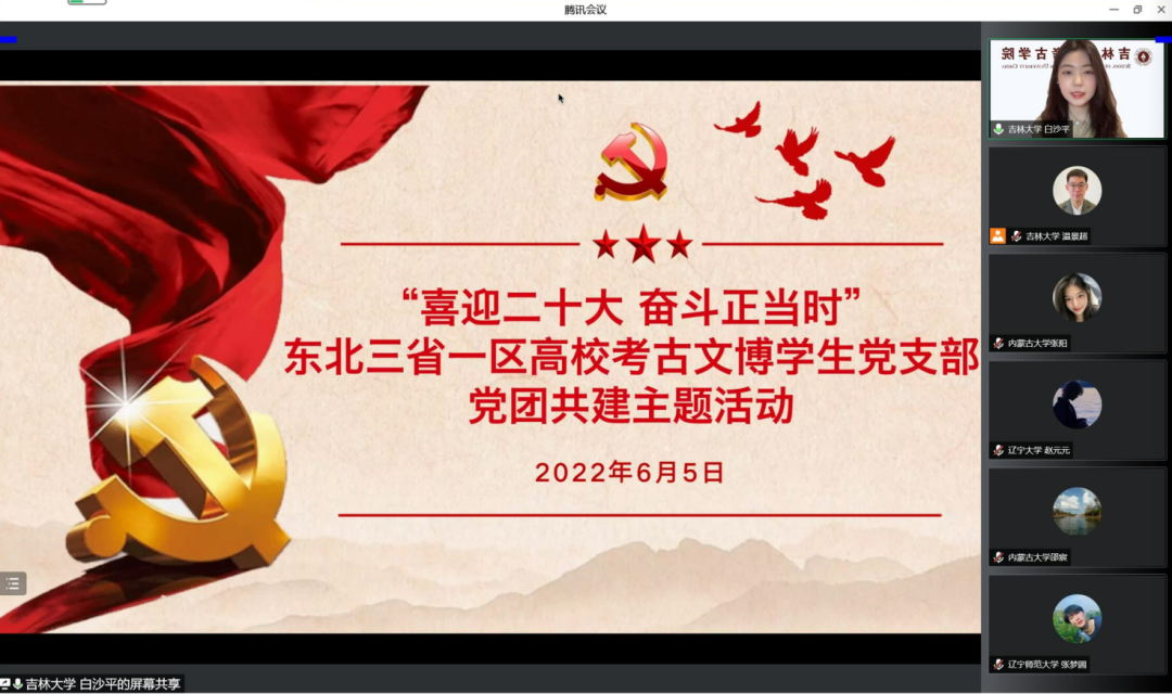 本科生党支部联合东北师范大学、黑龙江大学、辽宁大学、辽宁师范大学、内蒙古大学、内蒙古师范大学、赤峰学院,共8所东北三省一区的高校考古文博学科党团支部共同开展了“喜迎二十大 奋斗正当时”主题党团共建活动。活动以线上方式开展,来自东北地区高校考古文博单位的三十多位重庆时时彩领导、教师和二百余名学生代表相聚云端,共同交流了高校考古文博学科协同发展、高校党建与学生思想教育融合发展、新时代考古青年的责任担当等议题。