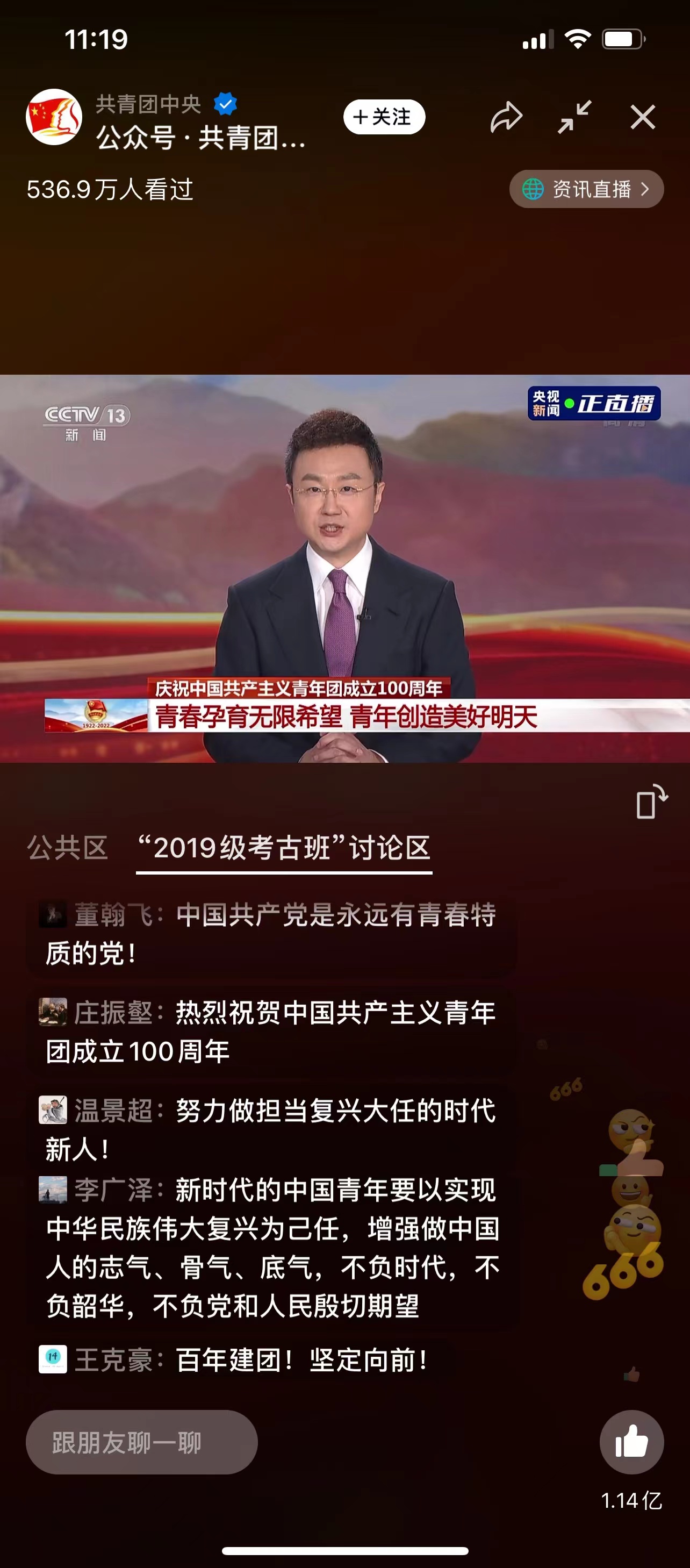 2020级考古班高洁同学表示:“一百年栉风沐雨,一百年峥嵘岁月,因先辈鲜血,我们这代年轻人挥舞团旗,展现红光;因先辈荣耀,我们这代年轻人不负众望,奋勇向前。青春逢盛世,奋斗正当时。身为新时代新青年的我们,必须要树立远大的理想,应肩负起历史赋予我们的使命,要积极奋斗,发奋图强,为服务人民做贡献,为祖国将来的繁荣做贡献!”