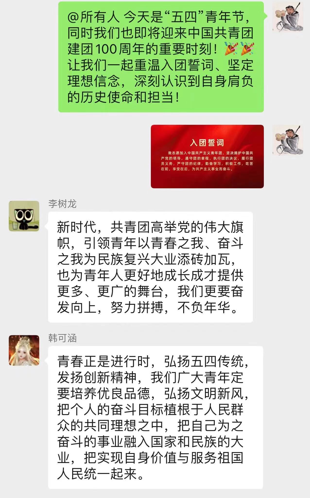 宣誓后,全体团员开启了线上讨论,畅所欲言。团员们表示,百年之前,以进步思想为武装的青年奋起斗争,接受马克思主义的指导,开启新民主主义革命的新征程。百年之后,当代青年应当在党的领导下,传承五四精神的薪火,建设青春之祖国,为祖国和民族的复兴梦想不懈奋斗,不负党和人民的殷切期望。下午五时许,各支部主题活动圆满结束。