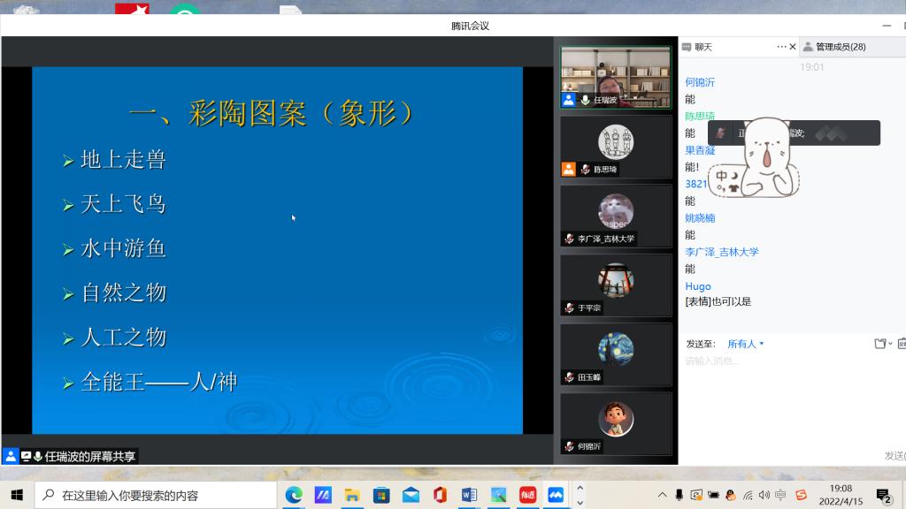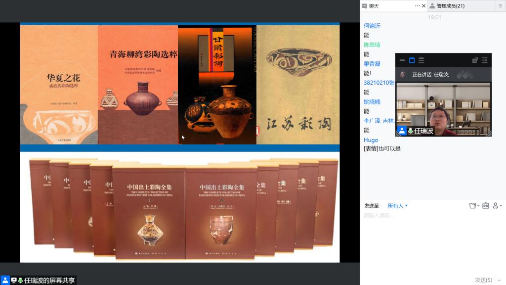 会议开始,任老师以数张亲身游历的彩陶实景引领大家进入彩陶的世界,并向大家推荐了一系列介绍彩陶的著作,以点窥面,巧妙地将彩陶融于宏观的艺术史中进行讲述,引出了本次会议的主题——彩陶纹饰。任老师按照从一般到具体的讲述逻辑,将第一部分象形的彩陶图案娓娓道来。本部分共分为地上走兽、天上飞鸟、水中游鱼等六大板块。其间,任老师将典型器物的具象纹饰与现实存在一一对比,并结合最新研究情况进行拓展补充,令人深感小小彩陶与社会习俗连接之密切。在第二部分,任老师用组合拆分和抽象演绎的方式对彩陶的特殊图案进行了解读,介绍了先人所创造的图腾、巫术、神灵等事物,解开了蒙在彩陶上的一层又一层神秘的面纱。讲解渐渐临近尾声,任老师借用名家之言向大家说道:无论是“为神绽放”还是“为礼歌唱”,彩陶无疑带来了文明的先声,掀起了不可忽视的艺术狂潮。而对于彩陶众说纷纭的解读现状,任老师表示,其“只有起点,没有终点”。在这方面,他向大家推荐了一部电影以深入了解彩陶文化,同时也希望能给封寝期间的大家带来乐趣。作为终篇的抢答环节,无疑是学术课堂的气氛最高点,同学们积极与任老师进行互动,揭示了一个又一个彩陶的“冷知识”。最后,在轻松活跃的氛围中,本次欢乐“云”学术活动落下帷幕。