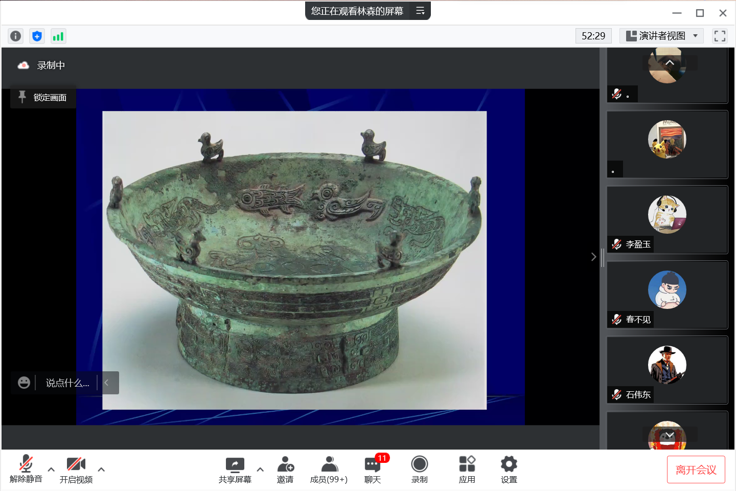 在云课堂上同学们紧跟老师思路,认真思考,对青铜纹饰的识别方法等提问,并踊跃参与互动回答,最后的有奖竞猜环节同学们积极发言,课堂气氛十分活跃。
