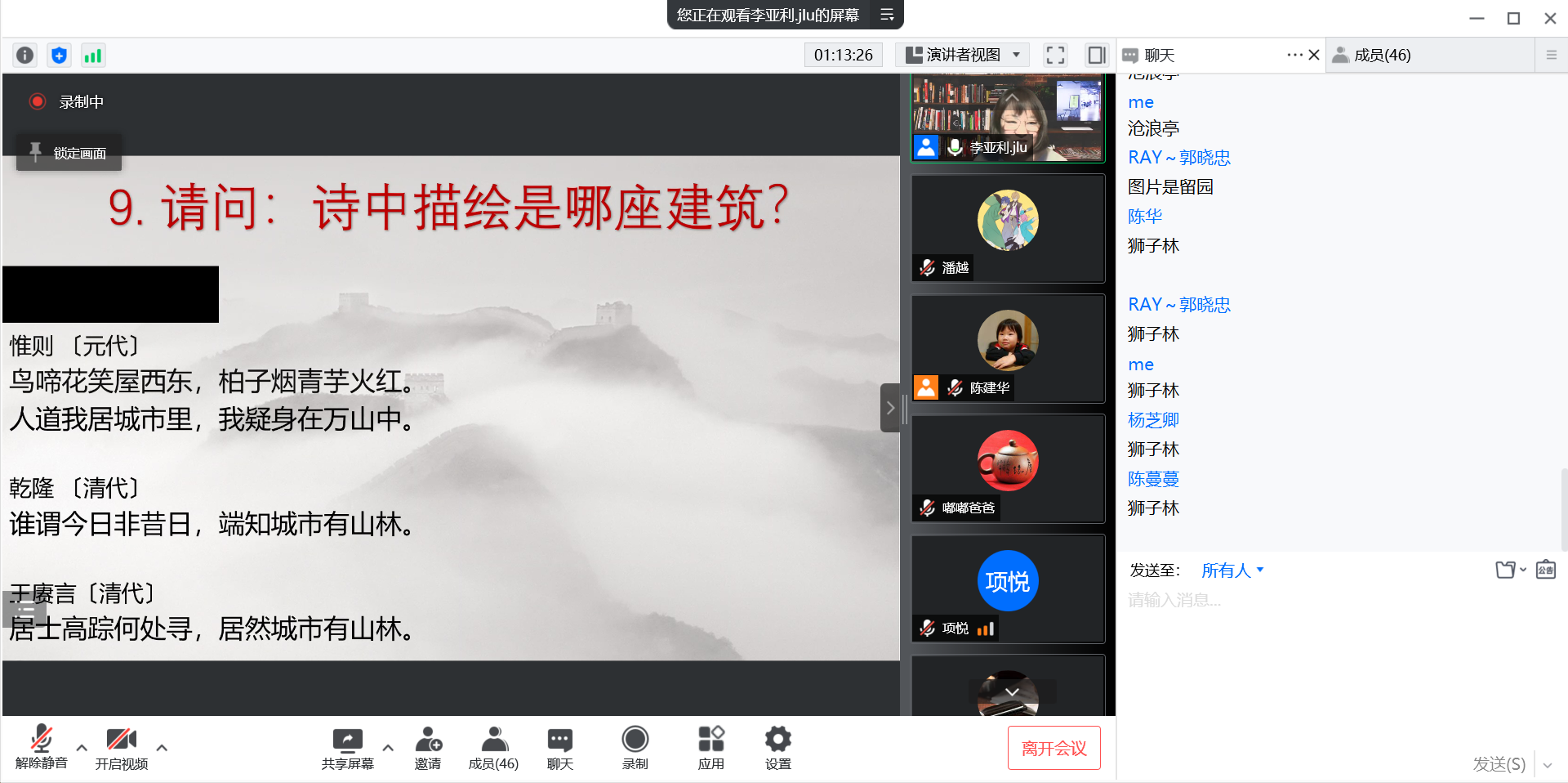本次活动中,李亚利老师带领同学们,从先秦到南朝,从夏季到冬季,“隐于宅中,寻幽览胜”,搭建了专业背景下的人文关怀平台,丰富了同学们在静态管理下的课余生活,让同学们在“宅”寝状态下,从一首首诗歌中,领略古代建筑之精妙、不忘追寻心中的诗与远方。