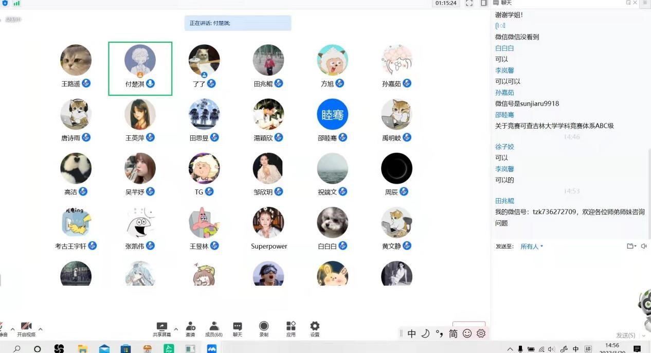 最后,保研至中国社会科学院大学的王英萍和保研至上海大学攻读文博专硕的周辰雨作了分享。王英萍介绍了保研的时间表,分享了复试的心得体会,她建议同学们要多搜集有关保研院校、导师与研究方向相关的信息,做好充分的信息准备。备考中要密切关注近年的十大考古新发现、百年百大等热点问题。周辰雨重点向同学们介绍了参加夏令营的经历。她指出,夏令营的时间一般是在六月,参加夏令营需要一些准备材料,例如成绩证明、科研与大创项目、英语成绩等。随后她分享了自己在大创中的体会,并对同学们的疑问做出了解答。