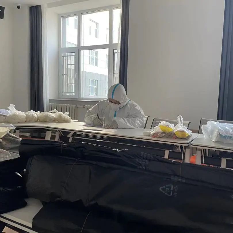 除了志愿者,保洁阿姨们也在为了保持学生居住环境的整洁默默付出着,她们每日穿着厚重的防护服,打扫着学生公寓百余间盥洗室的卫生。与我们交谈时,阿姨说“学生都非常理解我们,我们把宿舍卫生情况搞好,孩子们住的也安全。”
