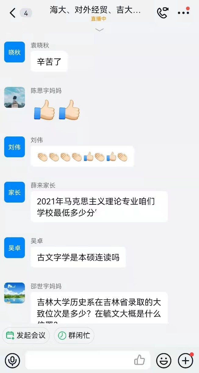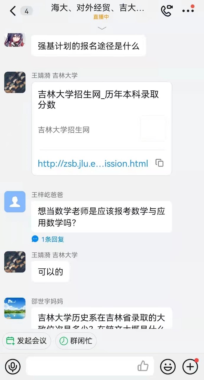 直播结束后,家长和学生们热情不减,接连提出了许多问题。团队成员针对这些问题在宣讲群里逐一进行了解答。其中一位家长,他的孩子对于吉大法学心仪已久,十分期望未来能够进入吉林大学学习,但苦于临近高考而成绩不够稳定,有些忧虑,于是向宣讲组征询意见。团队成员在介绍吉大法学专业的优势后,也从自身经历出发向这位家长提供了一些高中时的有效学习方法,希望能够帮助到学弟学妹。最后团队成员也鼓励了正在紧张复习的高三学子,期待他们取得优异成绩。