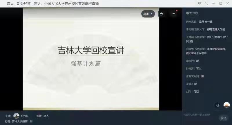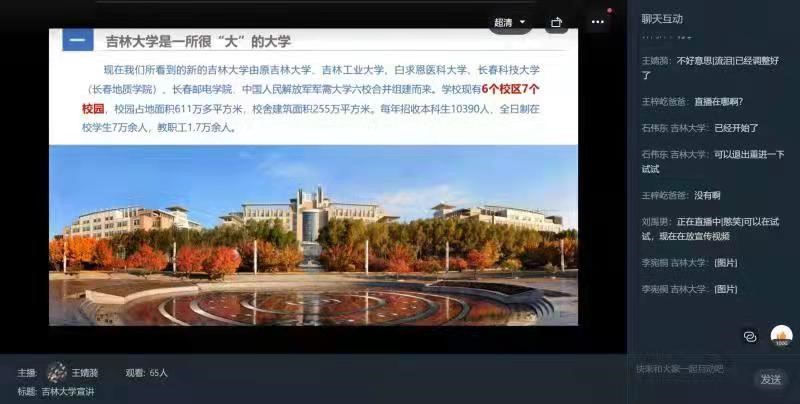 2月13日下午,线上宣讲会正式开始。由宣讲队的王婧漪和石伟东同学担任主讲,分别介绍了吉林大学的校情校史、强基计划。直播过程中,各位家长和同学非常积极,提出了不少问题,团队其他成员则负责在群里进行答疑。