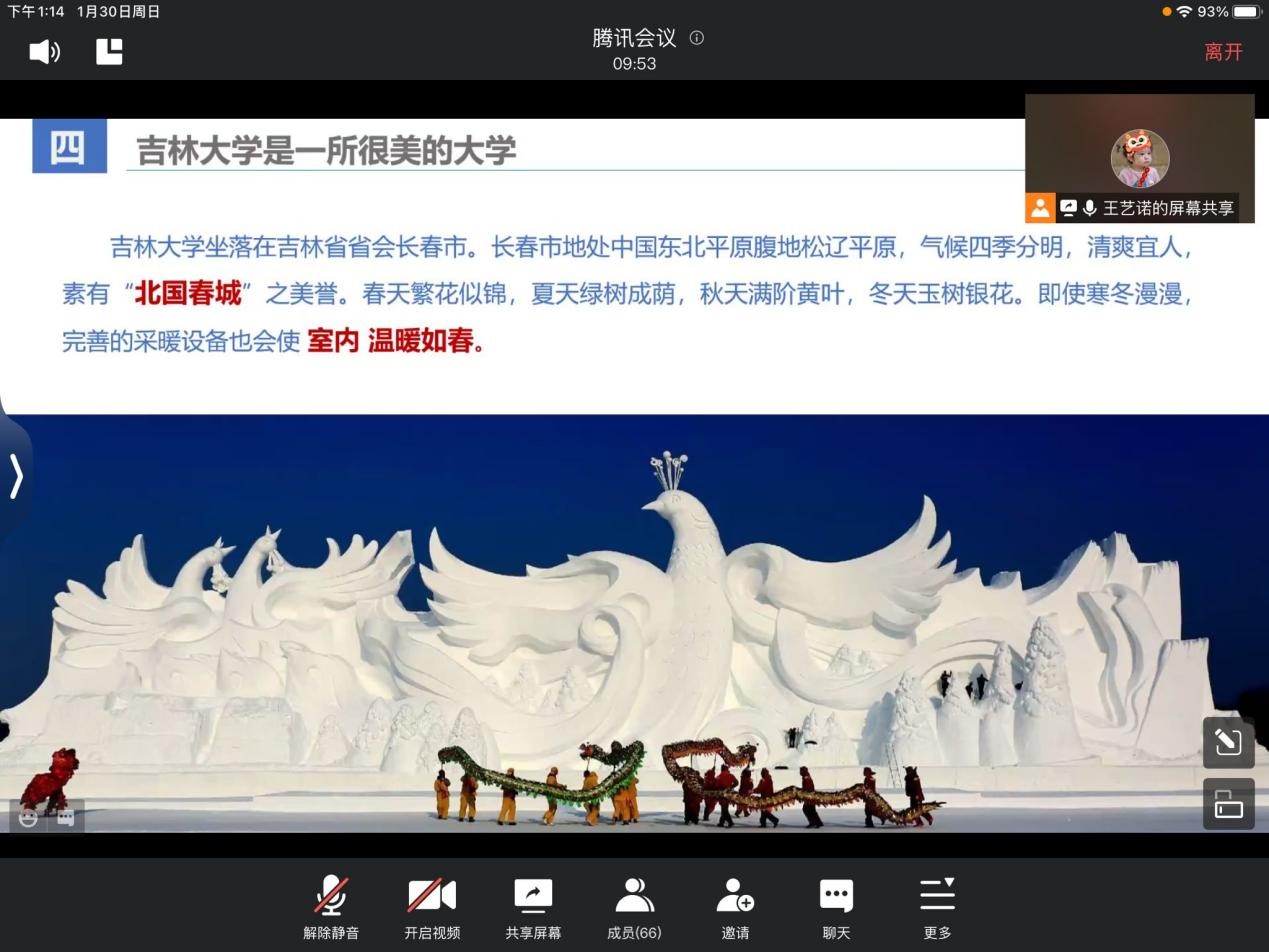 2022年1月30日下午,李逸然同学所在的招生宣讲团队在母校延边第二中学正式开始了招生宣讲。由于疫情管控要求,团队通过腾讯会议举办了线上宣讲。队长王艺诺同学主持了本次宣讲会,其他团队成员作为与谈嘉宾,对主讲内容进行补充。宣讲会主要分为两大部分,第一部分为校情陈述,由主持人借助学校的招生视频等资料,从学科实力、校园环境到衣食住行,对吉林大学进行全面介绍。第二部分为问答环节,由队员根据高中学弟学妹们的提问,尤其是学科专业等问题,做出深入细致的讲解。在这一环节,学弟学妹们热情高涨,提出的问题包含学习生活、日常生活等多个方面,李逸然同学结合了自身经历,从多个角度为同学们讲解丰富多彩的大学生活。会议结束后,实践团队和母校同学建立了招生宣讲的长效沟通机制,随时帮助学弟学妹答疑解惑,以便持续扩大学校招生影响力。