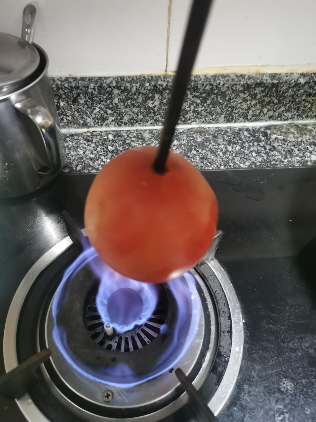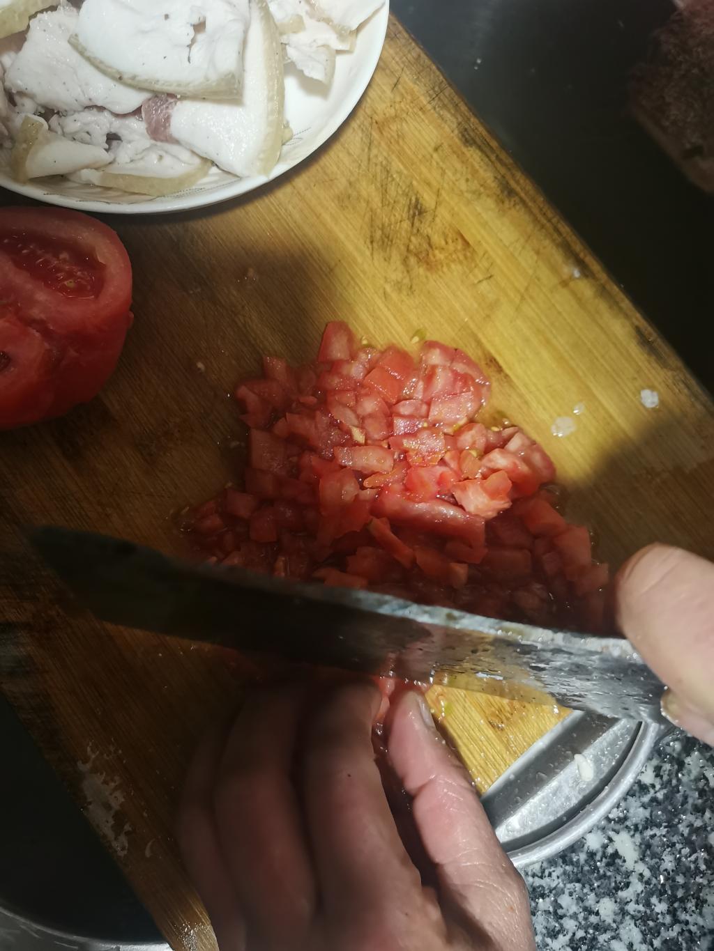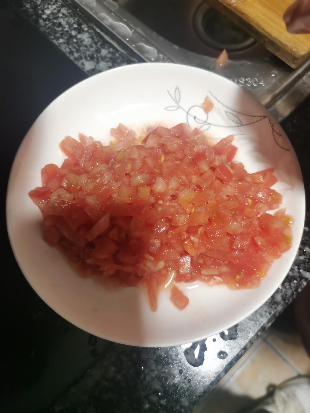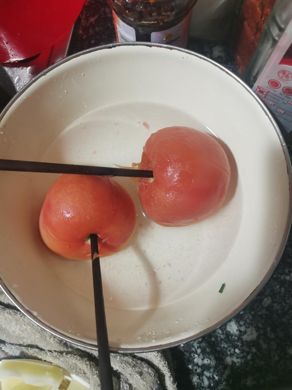 番茄炒蛋——先于番茄上切十字,于火上烤至可去皮,然后切块;三个鸡蛋倒入碗中调匀。热锅加入适量油,待其热后加入番茄与蛋,不断搅拌翻炒,加入盐、味精,倒入盘中,制成!