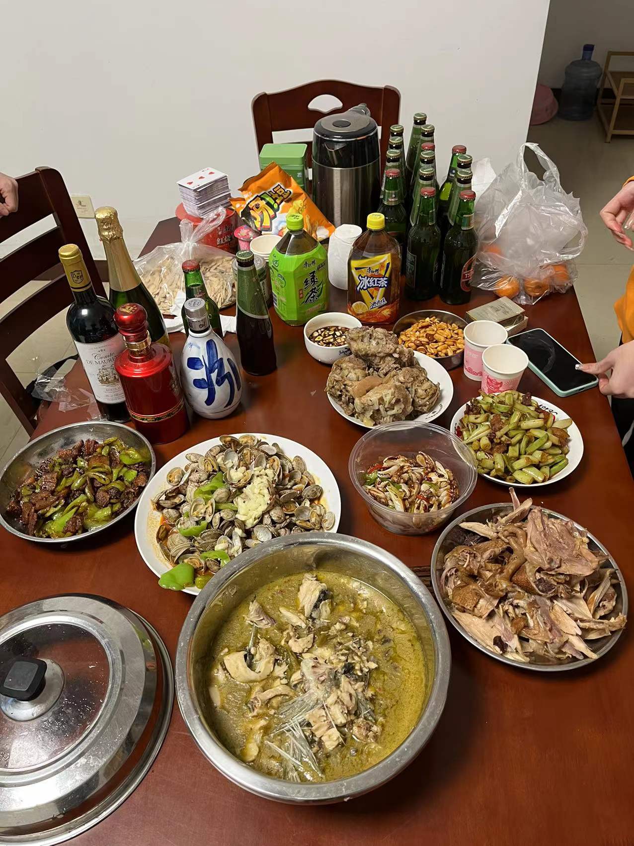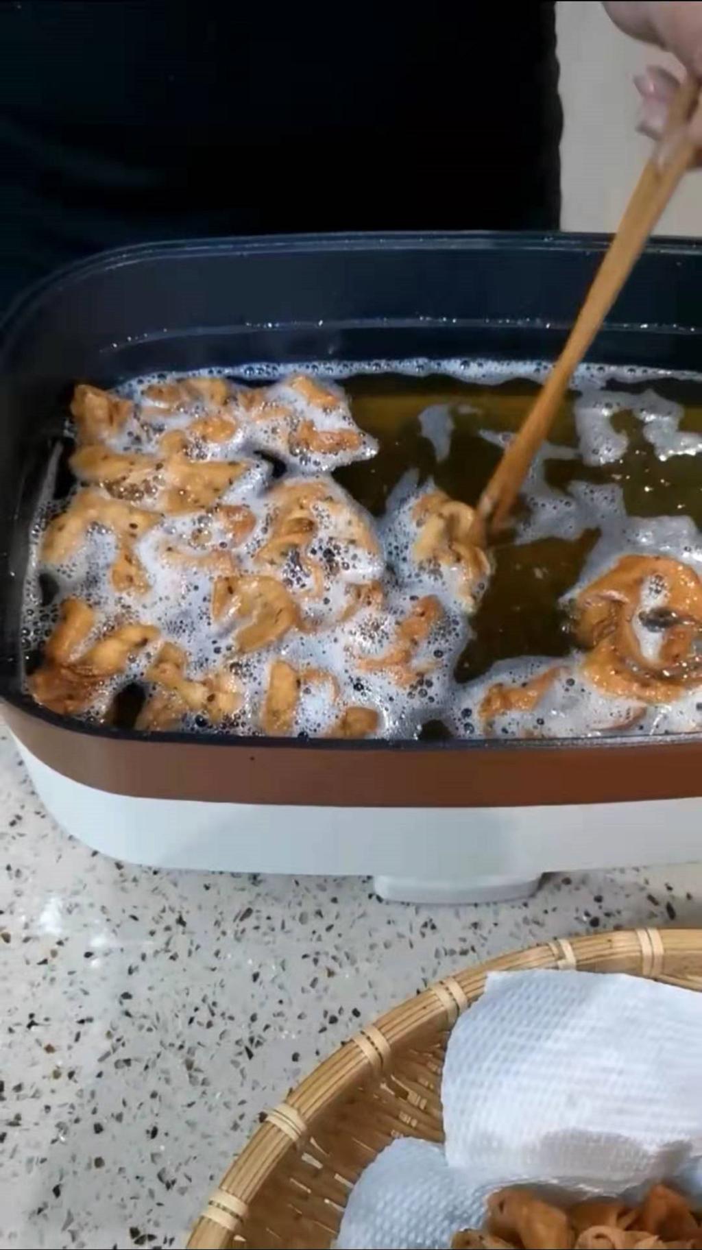金柏宇同学则在自己亲身动手操作实践后,向我们介绍了一份独特的食物制作流程——炸麻叶。炸麻叶是中国北方地区传统小吃,是金柏宇的家乡春节习俗的一部分。炸好的麻叶因形似叶子,布满芝麻,被称为麻叶。制作麻叶要在盆里放入面粉、水、鸡蛋、小苏打、油、芝麻、盐。然后和面,将面揉成光滑团状,盖住盆口醒发。醒完面取出后继续揉,压扁擀平至薄厚均匀的圆形或矩形,这一步很关键,擀得越薄,炸完越脆,但过薄容易断。用刀将面宽度均等地分为几条,两条相叠,纵向切成几份,每份中间开一刀。拿起一份,将左侧的面从上往下从刀缝中穿出,右侧从下往上穿出,两手轻轻一拉,放入油锅煎至金黄,炸麻叶就大功告成,炸出来酥脆可口。
