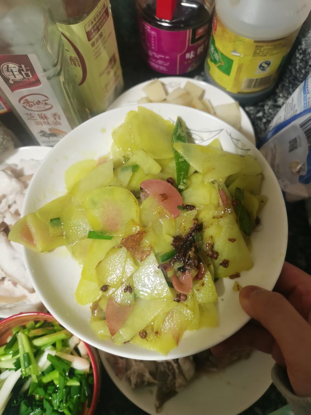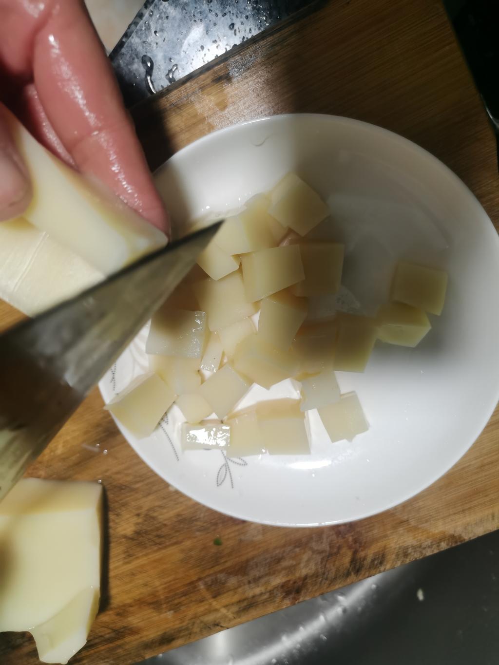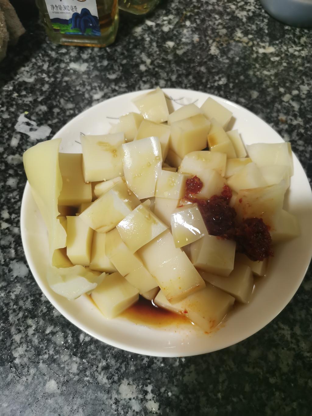 凉拌米豆腐——重庆西南地区的特色小吃。它是用米浆加碱熬制冷却而成。王丽娜先将其切块,倒入盘中,再加入少许味精、酱油、醋,还有特制的酱辣椒,制成!