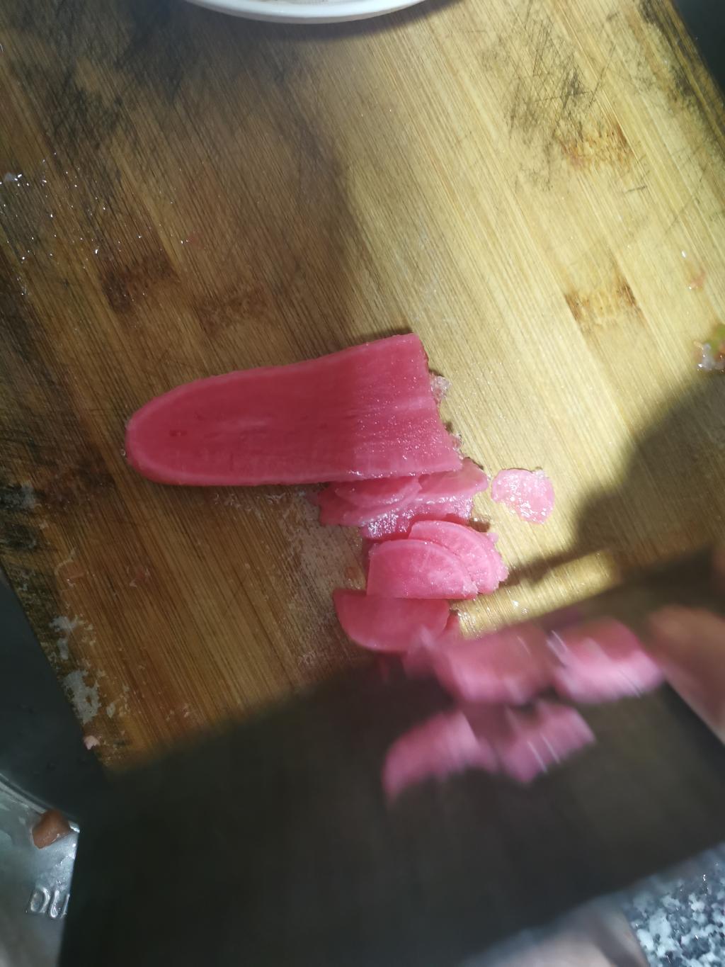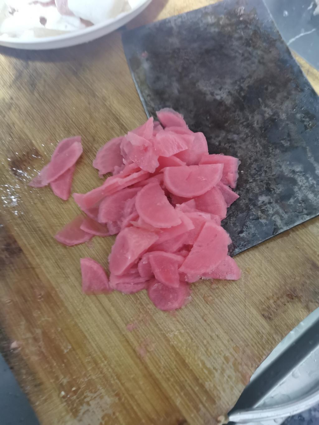 酸萝卜炒肉——将肉、青椒、酸萝卜切片,依次倒入于滚烫油锅中爆炒,加入花椒、盐、味精,翻炒待其入味后倒入盘中,撒上大葱,制成!