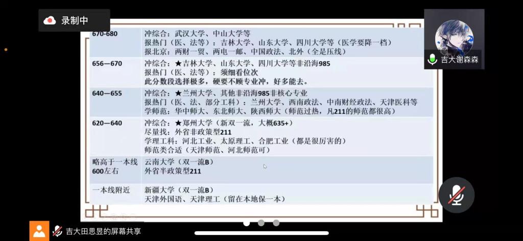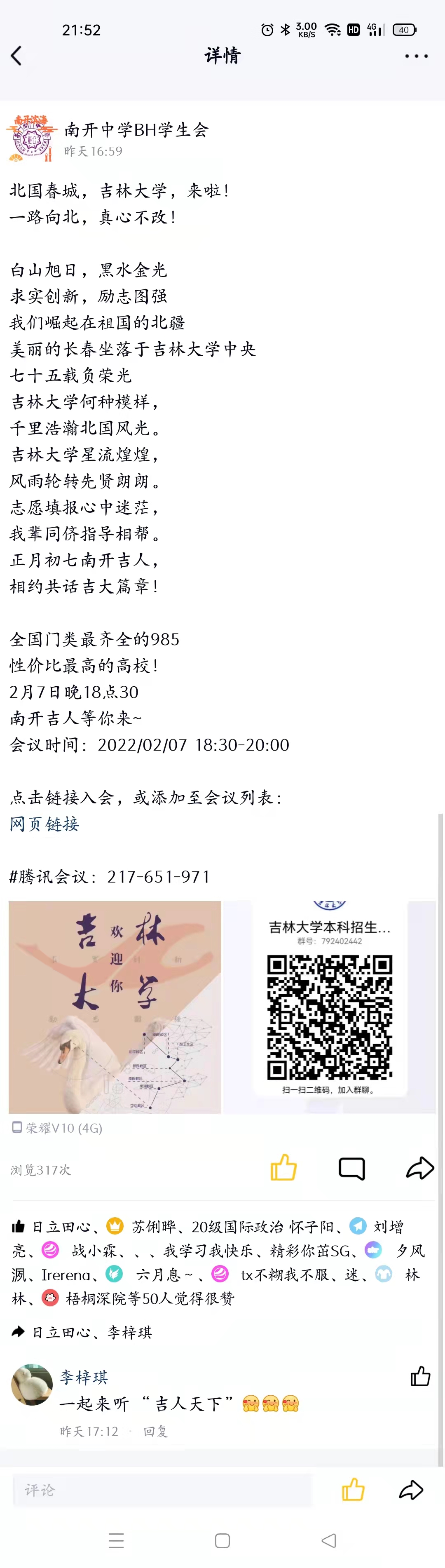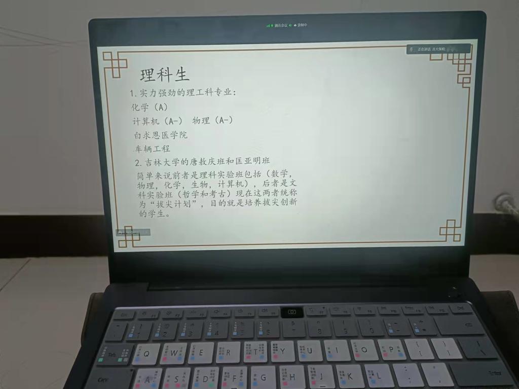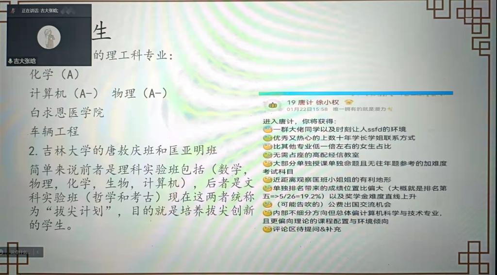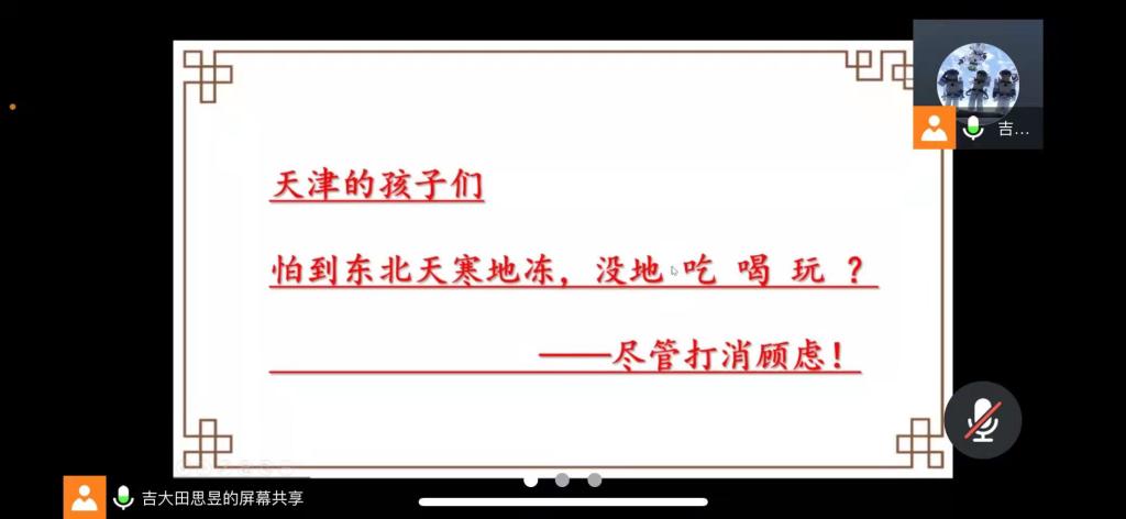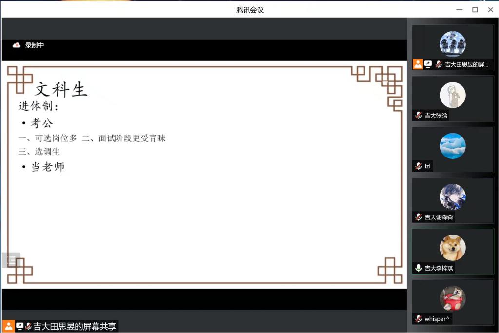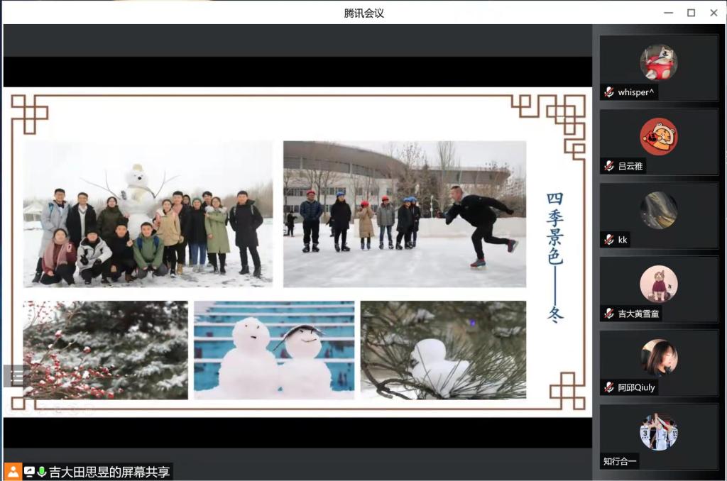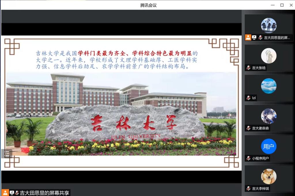 2022年2月7日,田思昱同学与来自吉林大学行政学院、通信工程学院、计算机科学与技术学院、经济学院的四位同学一起组成了“南开‘吉’人宣讲小队”,开展了“千人千团进校园,招生宣传拓影响”专项实践活动。“南开‘吉’人宣讲小队”的五位同学都毕业于天津市南开中学滨海生态城学校,在这个寒假,他们就吉林大学的基本情况向母校在读的学生和其家长进行了宣传和讲解。受到天津疫情的影响,这次宣讲他们选择了通过腾讯会议,进行线上宣讲。