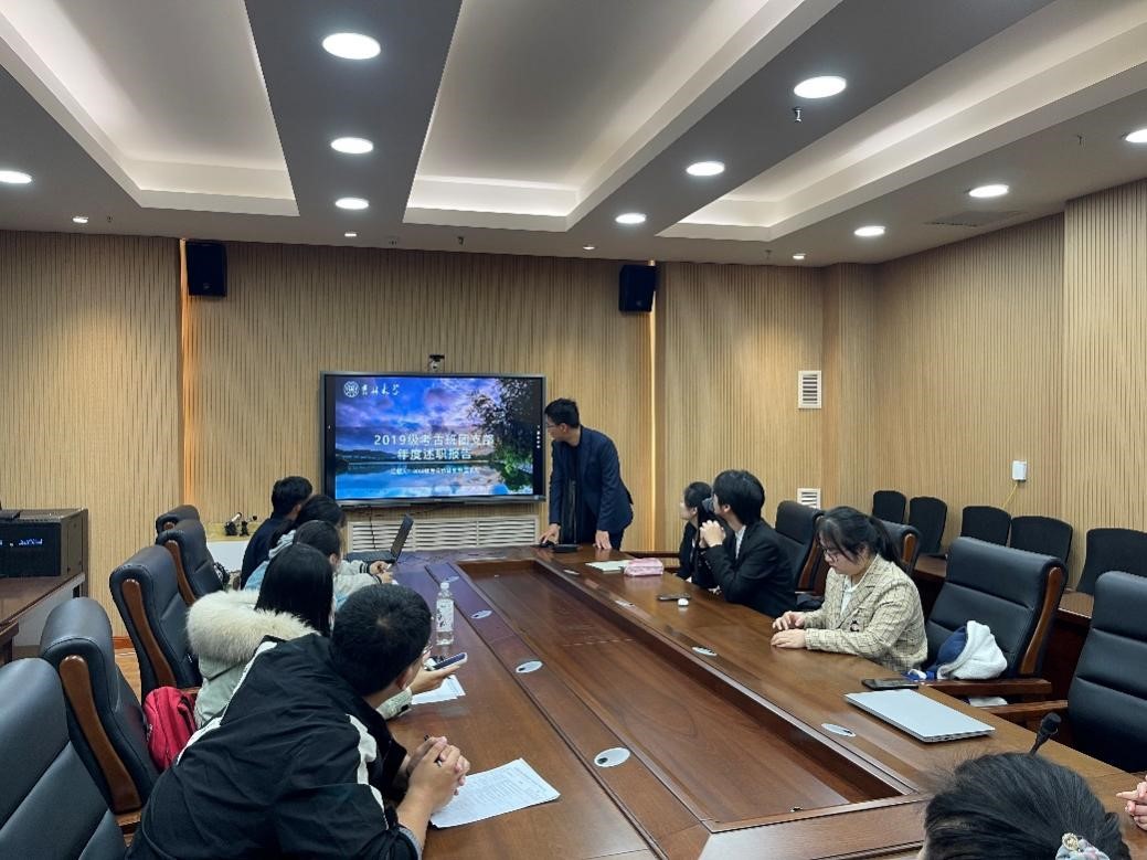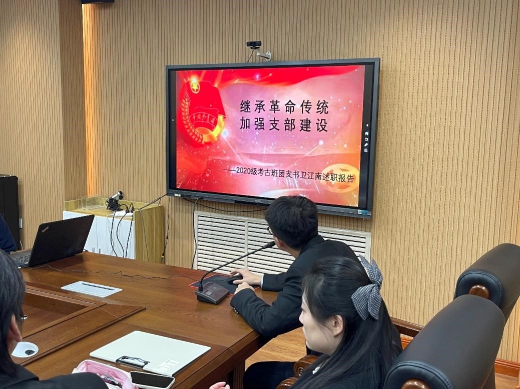 在评审会议召开之前,学院团委指导各班级团支部开展了自评讨论工作,让各团支部梳理总结了自身的工作成绩与不足。会议当天,团委实践部负责人王昱林主持开展了审议会。按年级顺序,分别由18级考古班团支书刘锡甜、18级文博班团支书耿默兰、19级考古班团支书温景超、19级文博班团支书徐逸凡、20级考古班团支书卫江南、20级文博班团支书李凡,依次就2021年组织建设和工作情况进行了述职,重点围绕团员构成、志愿服务、思想活动、实践活动、团支部自身建设等方面进行了阐述,系统展示了本年度各团支部的建设和发展情况。
