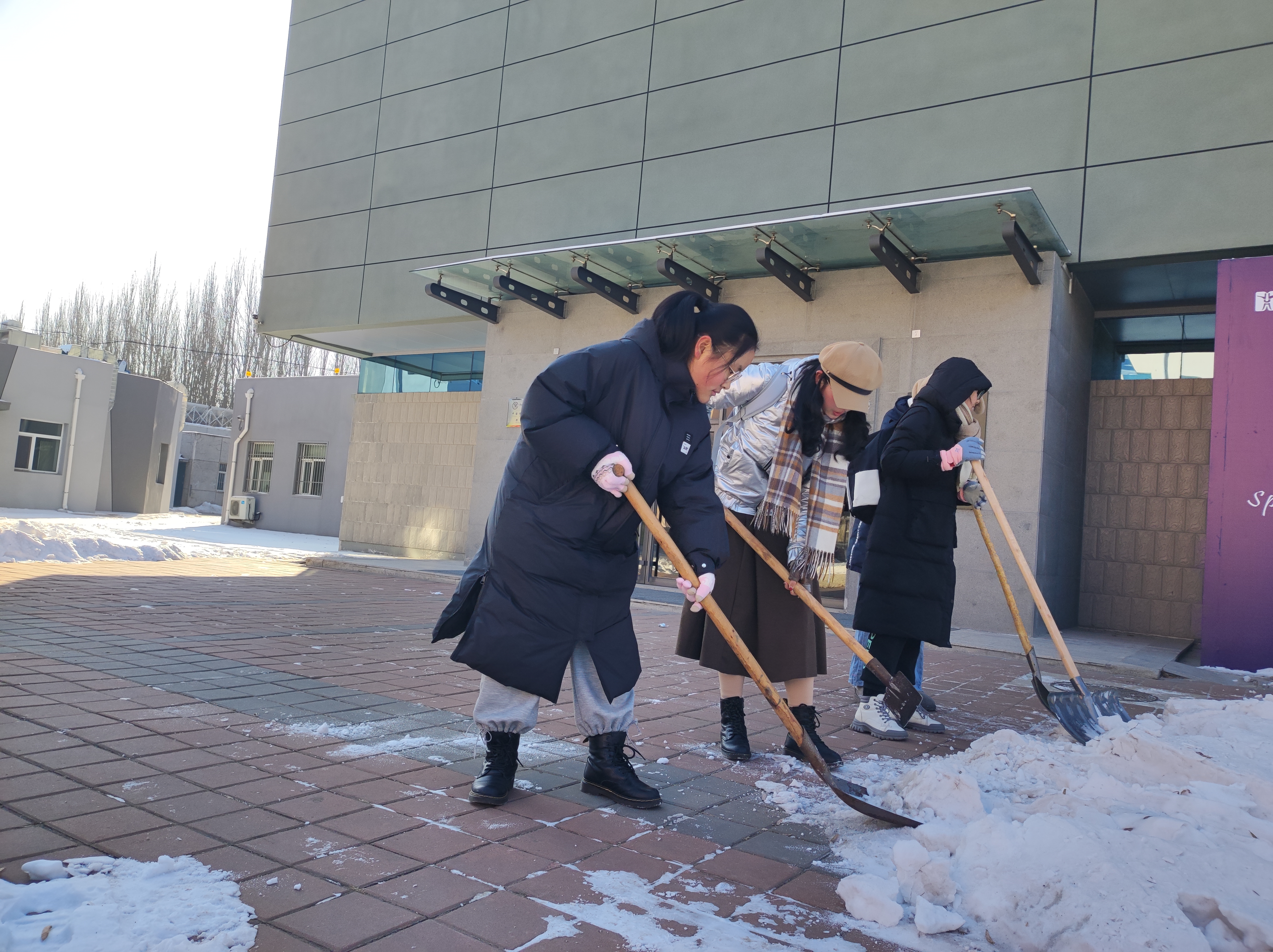 12点30分左右,田思昱、付楚淇、刘殷佚、杨柳和王清扬五位同学集合在考古与艺术博物馆前,在张馨予同学的带领下,大家不畏严寒,积极投身到扫雪除冰行动中。所有人都挥舞着铁锹和刀铲,有的铲、有的推、有的砸,齐心协力,分工明确,配合默契,干得热火朝天,忙碌的身影构成了一道靓丽的风景线。在劳动过程中,寒意逼人、人心却暖,大家劳动的热情和团结的力量显而易见,笑容洋溢在每位同学红彤彤的脸上。经过一个多小时的共同努力,原先的积雪冰冻被扫除,一条可供行走的安全道路被清理出来。