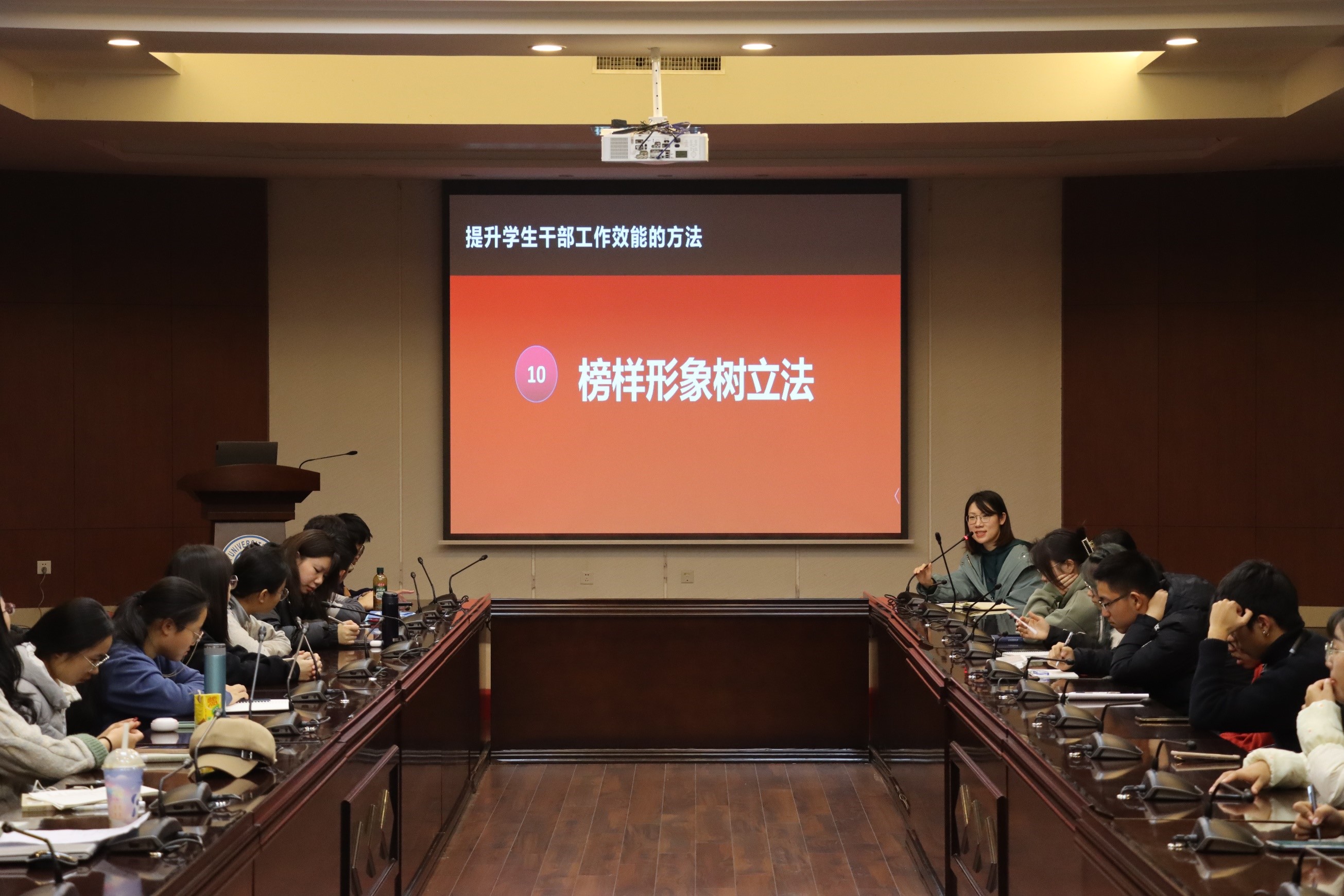 随后,马老师围绕“如何提升学生干部工作效能”这一问题,从日常调研分析法、工作氛围营造法等十个可参考性方法展开了深入讲解。与此同时,马老师要求各部门制定学期、月计划方案,并定期对本部门工作进行总结,形成月报制度。并期望学生干部注重日常调研分析,对自己的时间进行合理安排,各组织、各部门明确分工,团结互助,努力实现1+1>2的优势。这些建议无疑为团学组织的建设和学生干部的个人发展指明了方向。