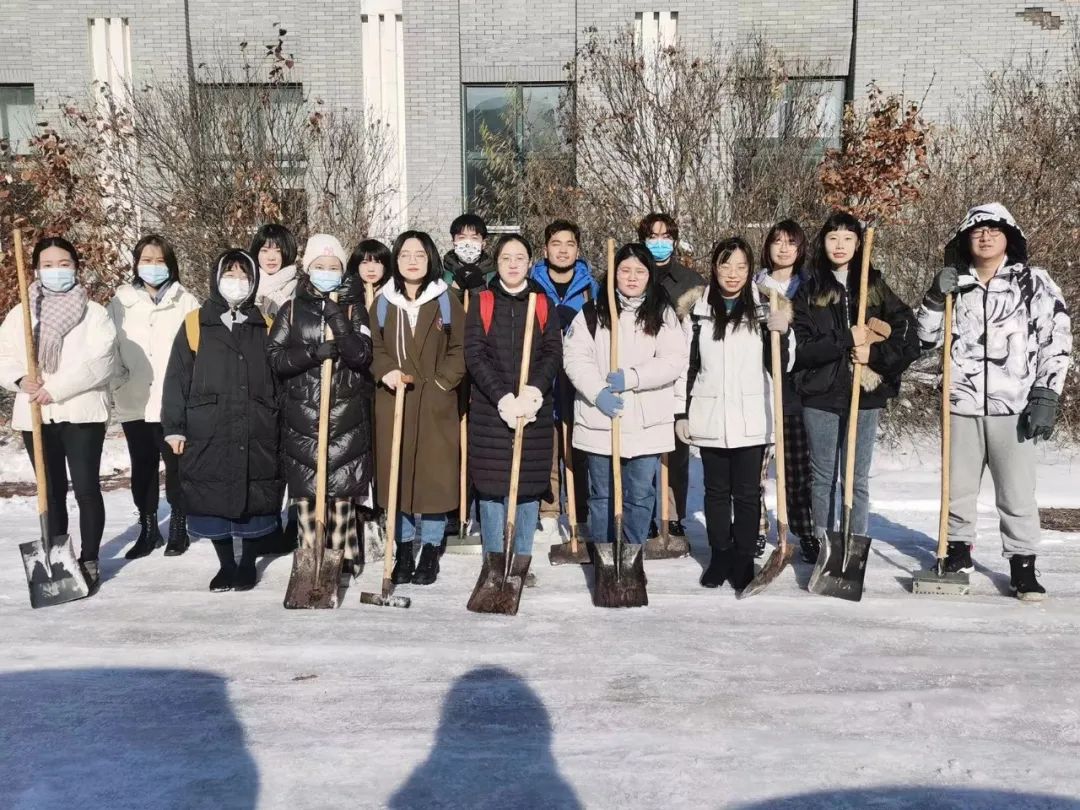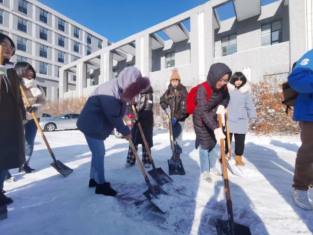各位党员同志顶着凛冽寒风,一路取出铲雪工具,分为铲冰和清雪两组合作进行。同学们不畏严寒,积极主动配合。开始的时候,大家都不太熟练,时间过半,大家纷纷找到了技巧,分工合作愈发娴熟,铲雪的速度也越来越快,不仅如此,人群中渐渐传出欢声笑语,大家越干越有劲头。
