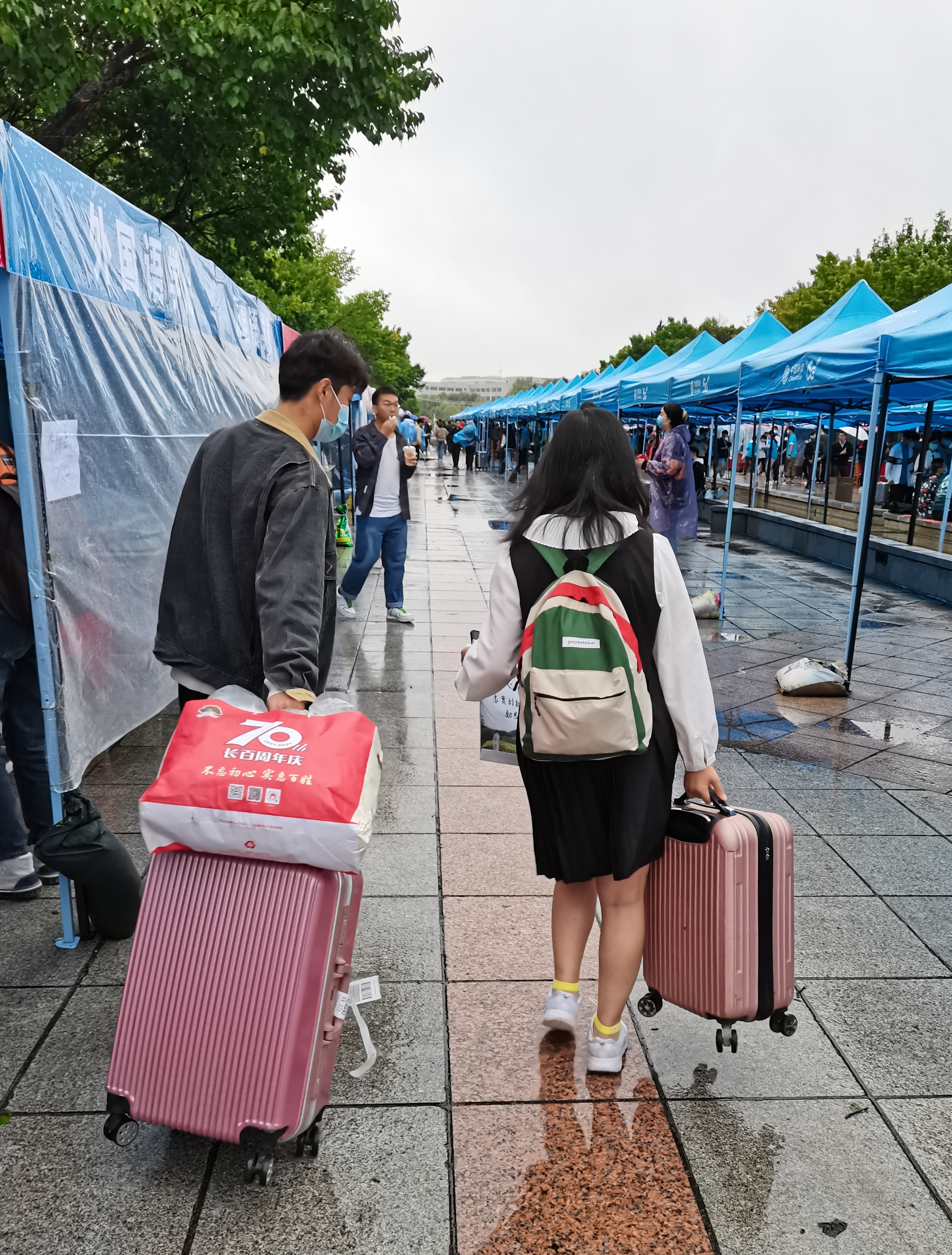 清晨秋风习习,裹挟着阵阵秋雨,给五月花广场平添了几分寒意,但这丝毫未曾影响现场的热烈气氛,辅导员助理和志愿者们仍以最饱满的热情认真整理迎新物资,有序布置迎新场地。上午6时,场地布置工作全部完成,现场全体师生准备就绪,期待良久的迎新工作正式开始!随着新生们陆续前来报到,迎新工作也如火如荼地开展起来。辅导员助理们细致核实每一位新生的信息,帮助新生完成各项报到手续,并逐一发放新生材料包。期间,辅导员马嘉男老师亲切询问新生来校方式与家庭情况,并贴心叮嘱加强自我防疫保护、增添衣物预防感冒等。随后,新生们由负责对接的志愿者引领前往宿舍。一路上志愿者们主动为新生们搬运行李,详细解疑答惑,帮助新生们尽快熟悉校园。在新生报到的整个流程中,每一个环节都有师兄师姐们的指导和陪同,他们亲切的态度和热情的帮助,很快就拉近了彼此之间的距离,让新同学在全新的环境中感受到了关爱与温暖。