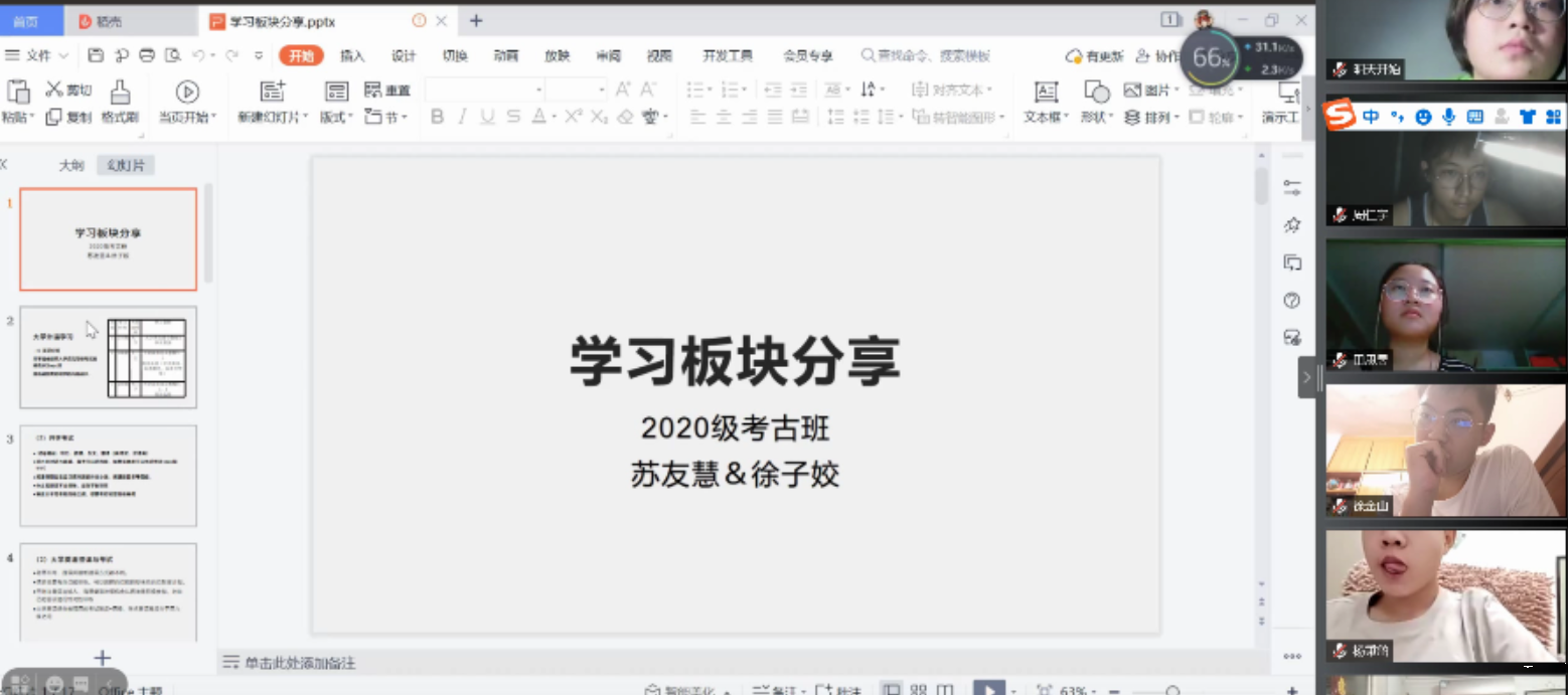 学生会科研学术部于9月16日晚七点,成功举办了线上青苗计划暨2021级新生学习分享会。本次活动由辅导员马嘉男老师指导,2020级鲁婕同学担任主持人,来自2020级的考古班苏友慧同学与文博班王丽娜同学担任主讲人,2018级田玉峰同学参与了会务工作。全体2021级新生同学参加了此次会议。