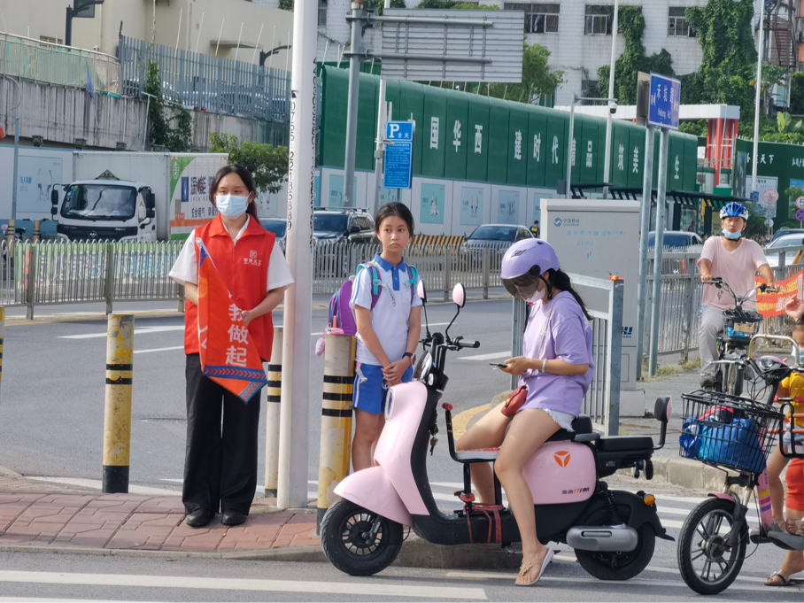 活动伊始,黎宇菲同学与社区工作人员取得了联系,在工作人员的介绍下认真学习了交通指挥的基本知识,熟悉了医院路口人流车流疏导的各项流程与规章制度,为接下来的工作做了充足的准备。随后,黎宇菲同学在做好个人防护工作的前提下,开始了疏导医院路口人流车流的工作。虽然绝大多数人都能理解并配合志愿者的指挥工作,但也存在一些人不理会义工善意提醒而横穿马路、闯红灯、拒绝佩戴头盔的现象。这种漠视生命安全的行为让黎宇菲同学产生了困惑,因为违反交通规则不仅是对自己生命的不负责,更是对他人生命和对社会的不负责。由此她深切地感受到尽管当前我们的物质生活水平已经获得了很大提升,但公民素养仍有待提高,交通安全意识有待加强。与此同时,为期三天的交通指挥志愿工作也让她体验到了交警、辅警的艰辛与劳苦。可以想象,一年365天不单要面临严寒酷暑,风霜雨雪,可能还会面临很多的误会和非议。她由衷地对这项事业充满了敬意。