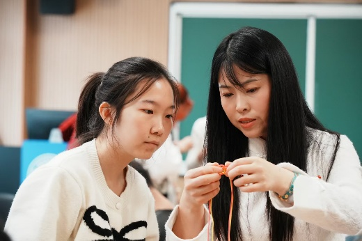 在制作体验环节,徐老师走入同学们中间,手把手指导绳编创作,耐心解答疑问。同学们沉浸于绳结的编织之中,在一缠一绕间感受非遗技艺的细腻与魅力。