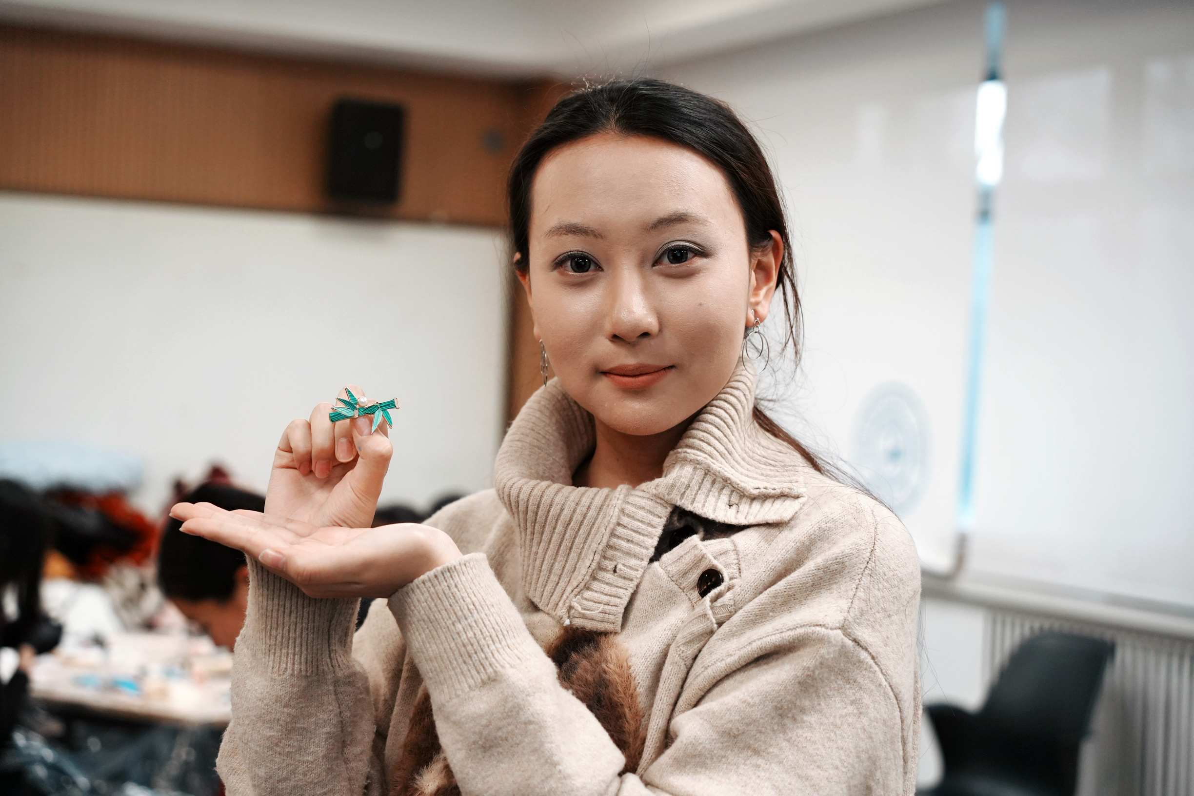 孙鹤菲从立冬民俗切入,生动讲述点翠工艺的发展历程,展现历代匠人的匠心独运。讲解尾声,她特别关注到点翠技艺曾经对环境造成的影响,呼吁同学们以环保理念为引领,让这门古老技艺在当代焕发可持续的生命力。